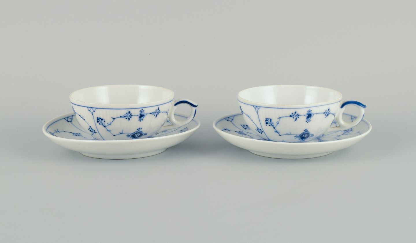 To sæt Royal Copenhagen Musselmalet Riflet tekopper og underkopper i håndmalet porcelæn.Model 1/76.