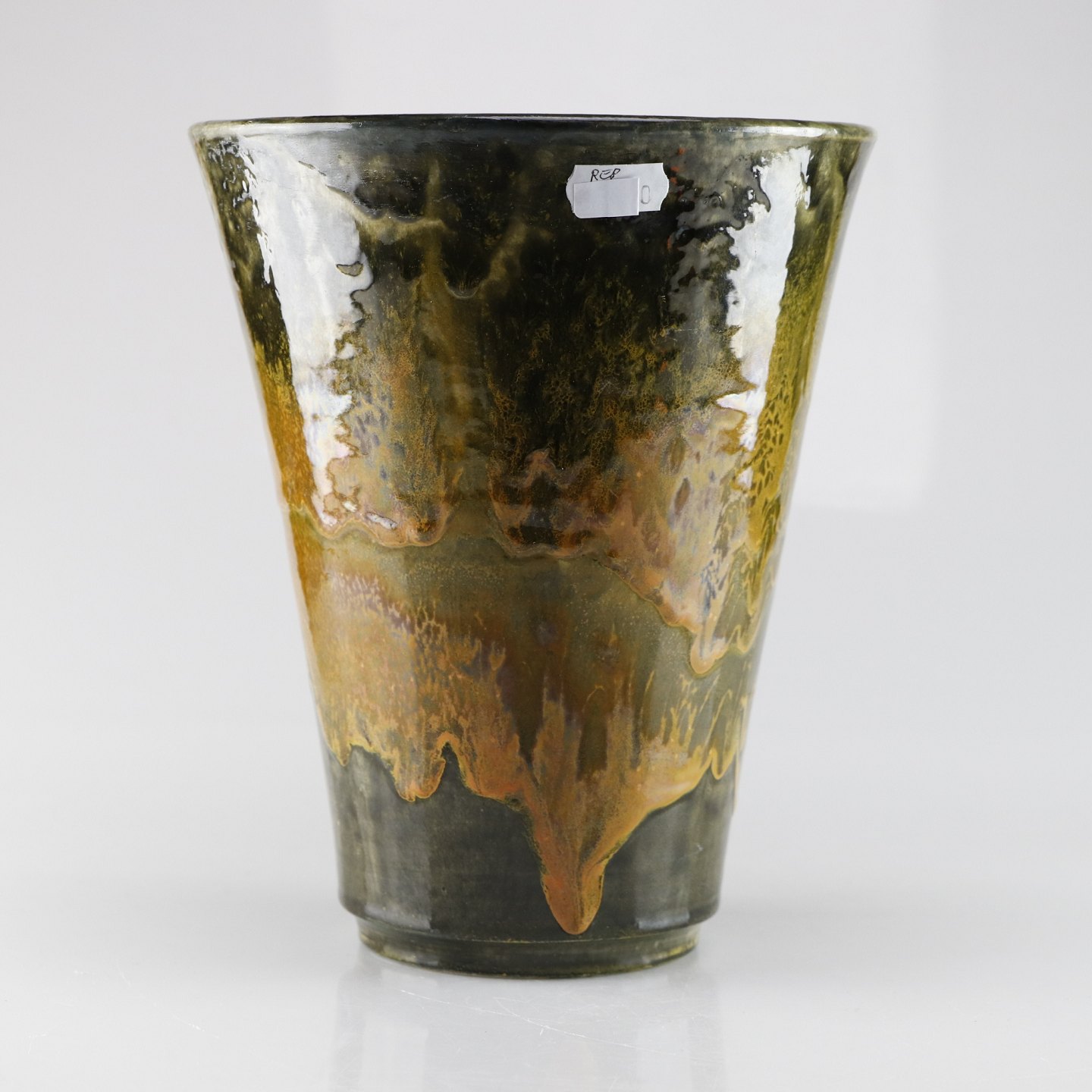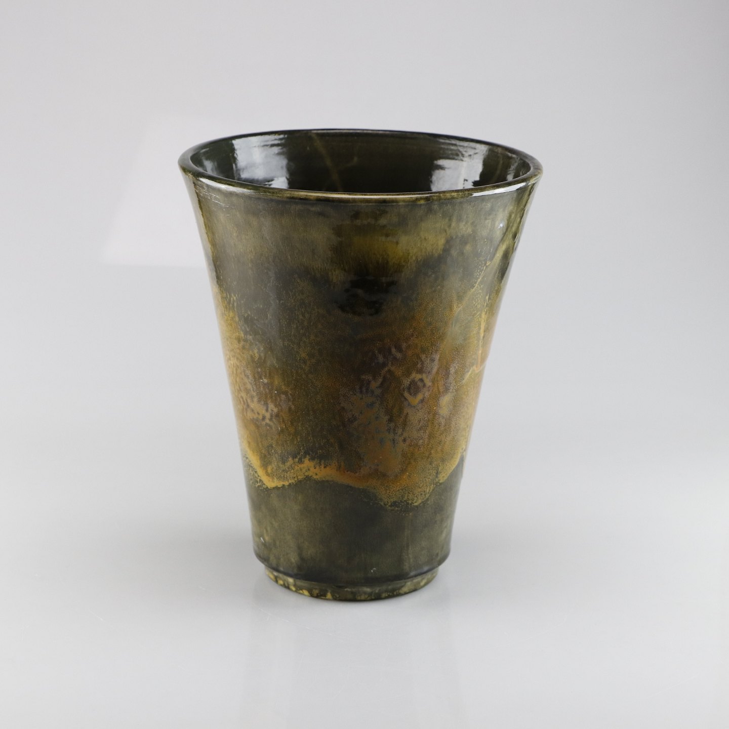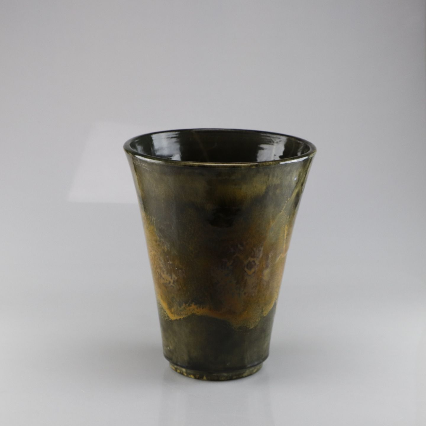 Keramik vase med grønne og gullige farver, Vasen har en ikke synlig reparation.Producent Kähler