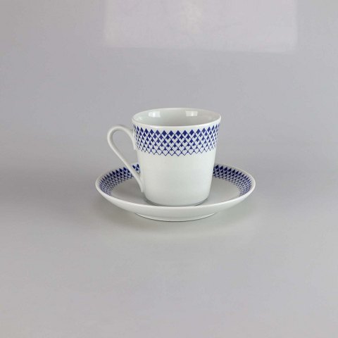 Glat hvidt porcelæn med dekoration af mørkeblå romber