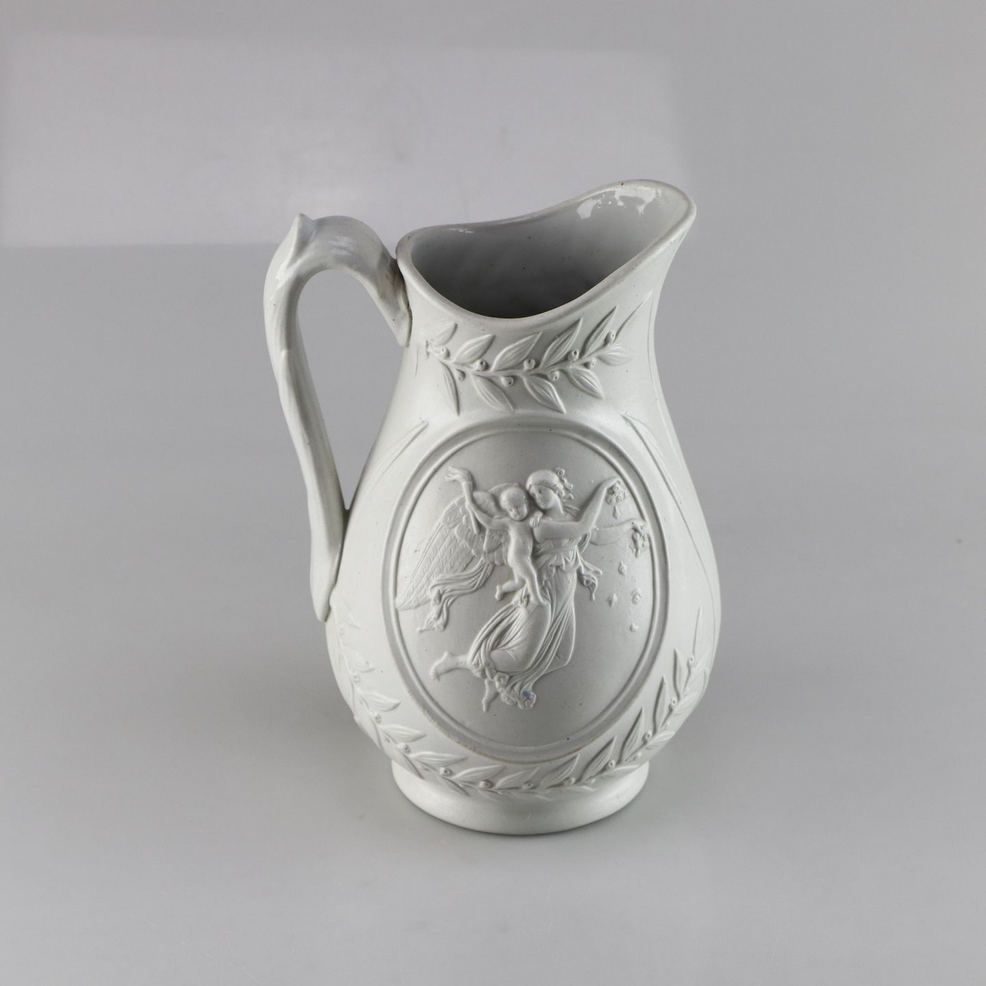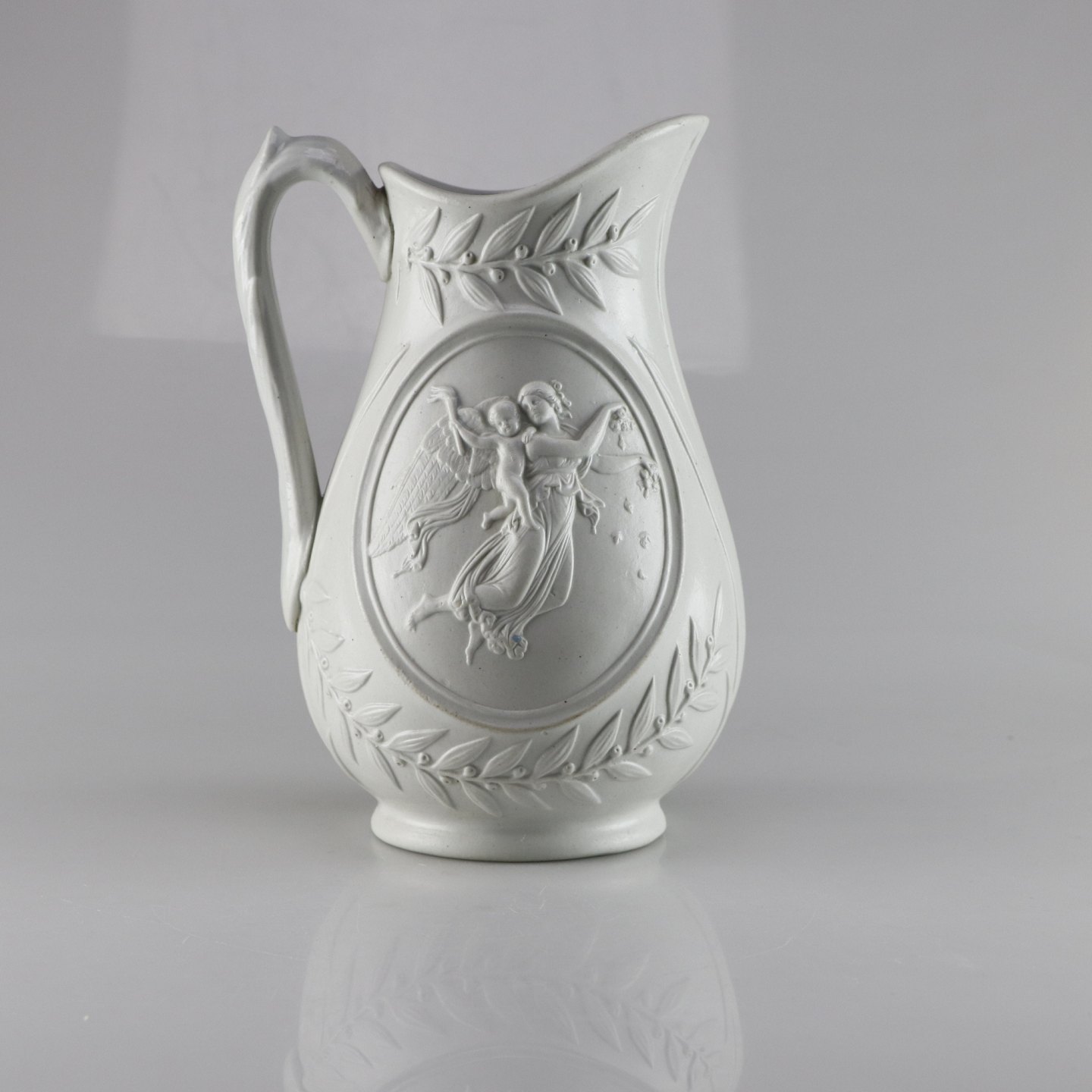 Mælke kande i fajance dekoreret med blade og de kendte Thorvaldsen Nat & Dag relieffer som motiver.