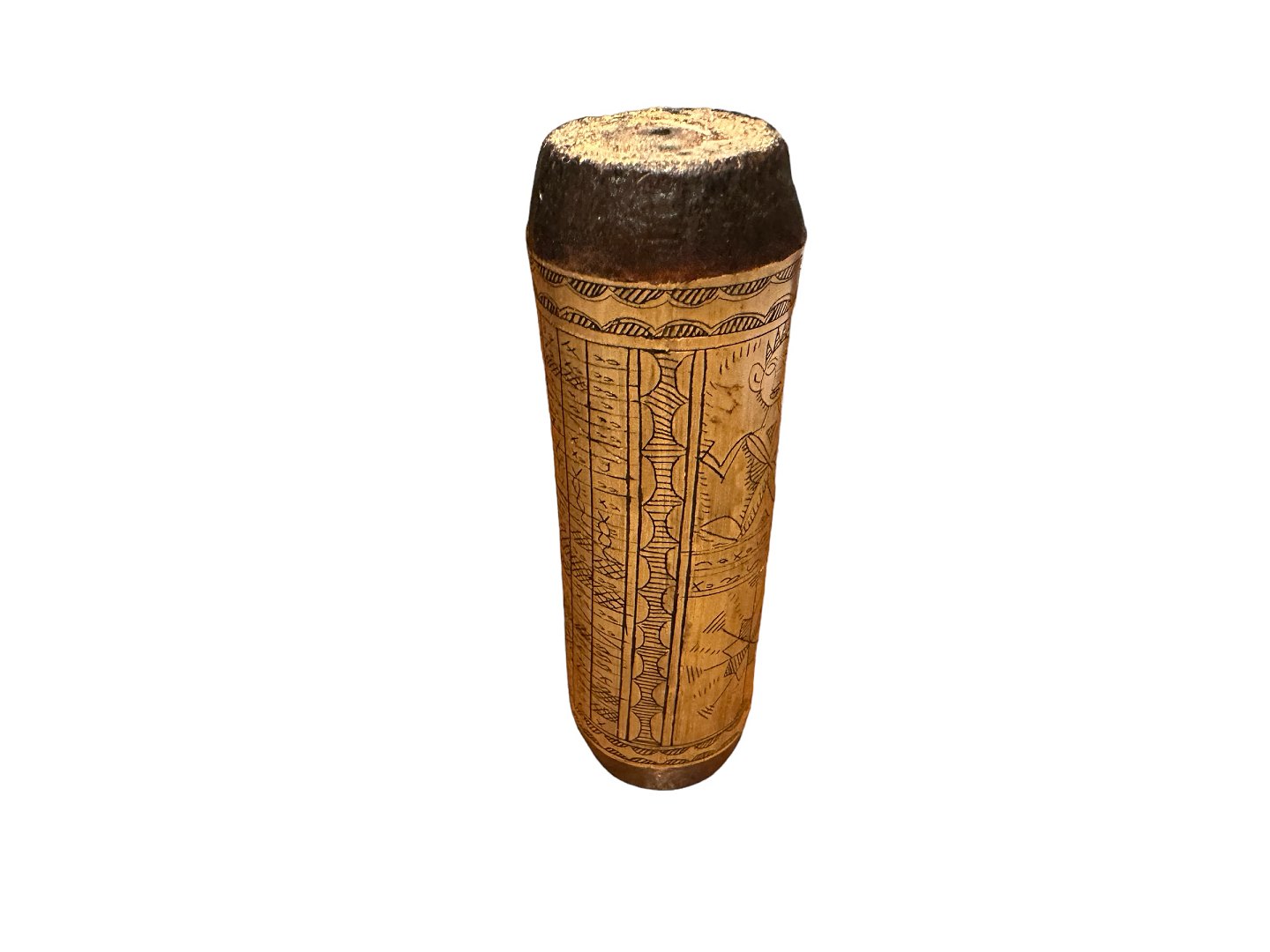 Cylindrical Indonesian Batak magical calendar from Sumatra - possibly also medicine container. The scroll has various tables, motifs and symbols inscribed on bamboo. The table has 30 fields vertically (days) and 12 fields horizontally (months).A Batak calendar was used by the Batak priest/shaman to find days that were favorable for ceremonies. 20th century.