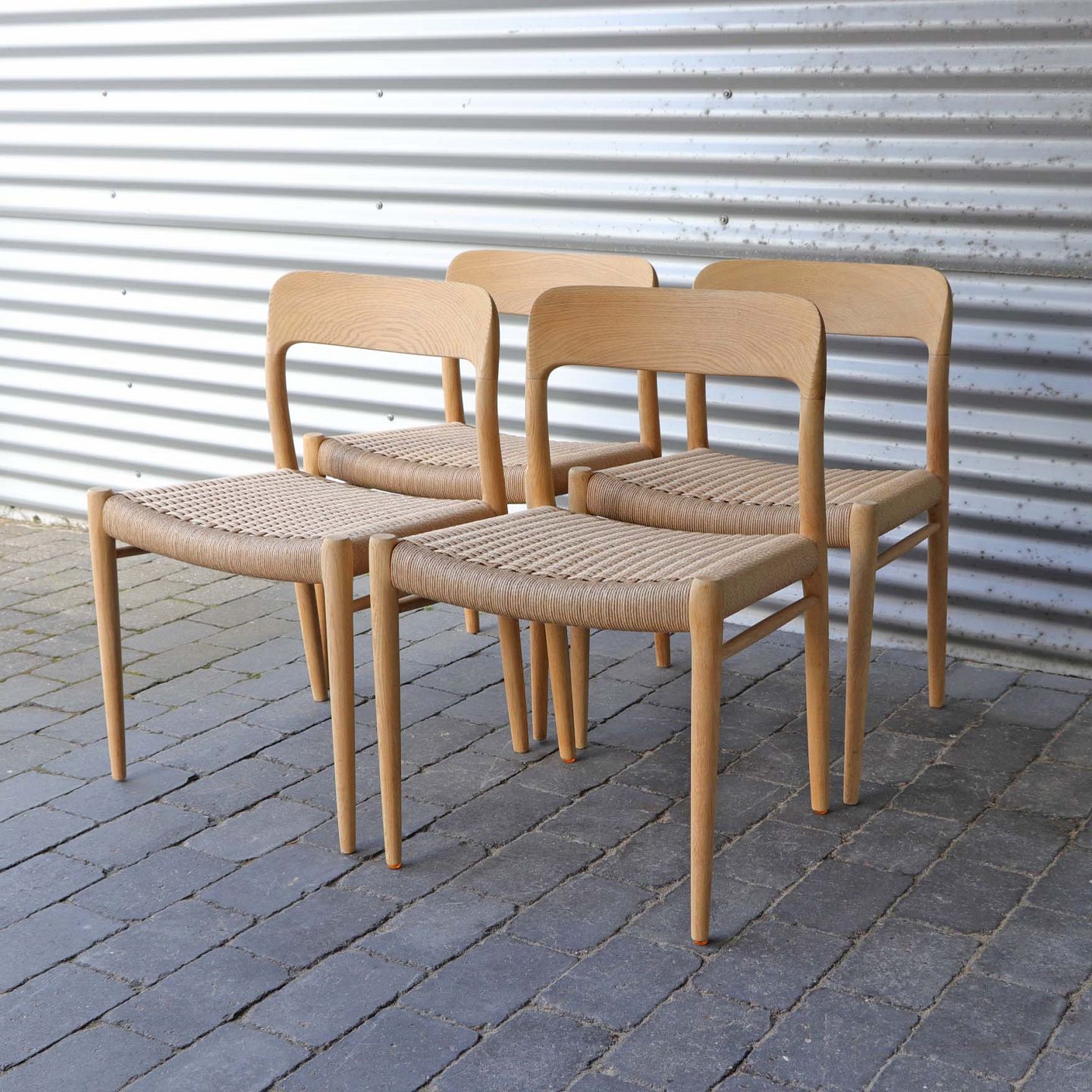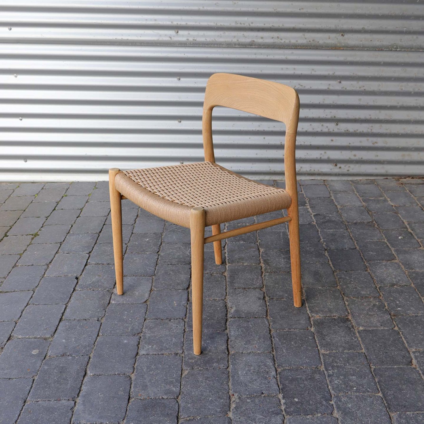 Et styk spisebordsstole model 75 i sæbehandlet eg med nye sæder i papirgarnsfletProduceret af Niels Ole Møller
