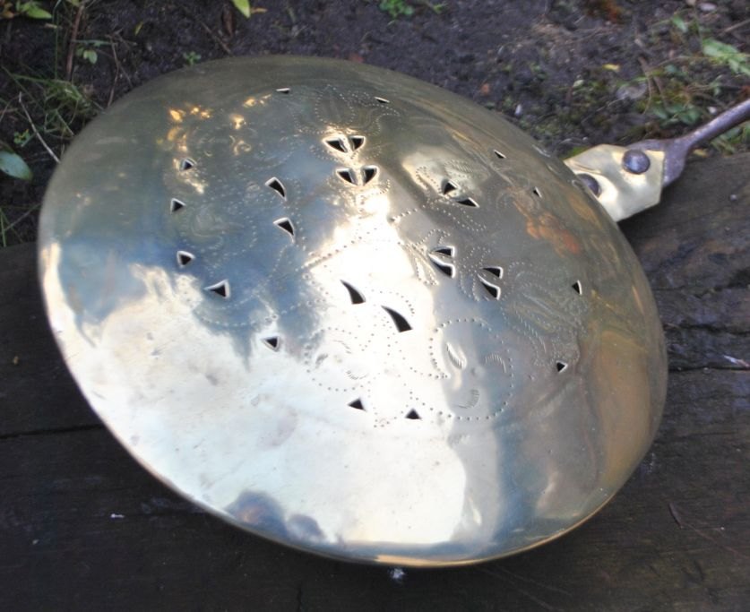 Danish heating basin in brass/iron with wooden handle. 18th century. L.: 115 cm. Dia.: 30 cm. Lid decorated with tulips. Stamped. Presumably work from Kobbermøllen in Flensburg.Item number: 25229