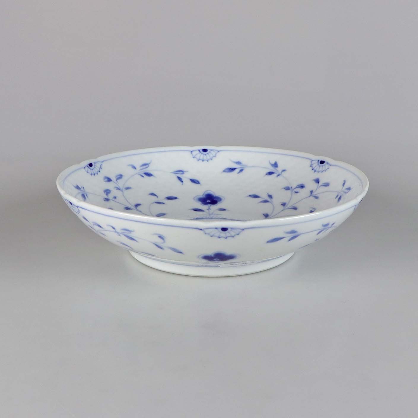 Skål i hvidt skælformet porcelæn med blå motiver af blomster og sommerfugle.