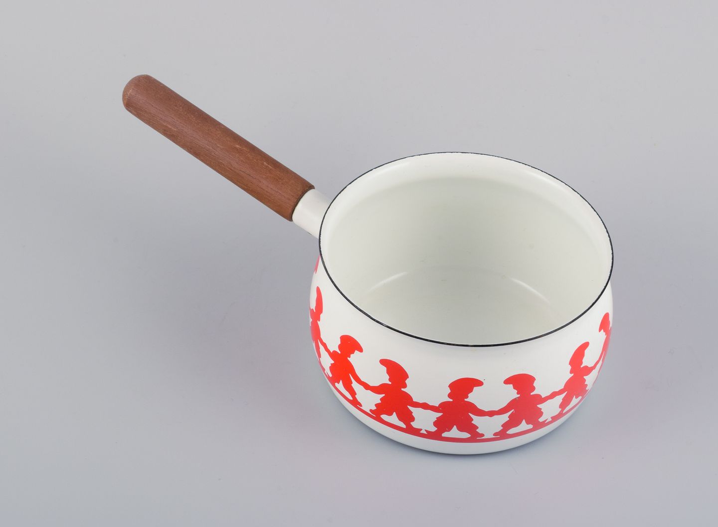 Kaj Franck, for Arabia, ”Tonttu” emaljeret metalkasserolle med træskaft, dekoreret med nisser i dans.1960’erne.