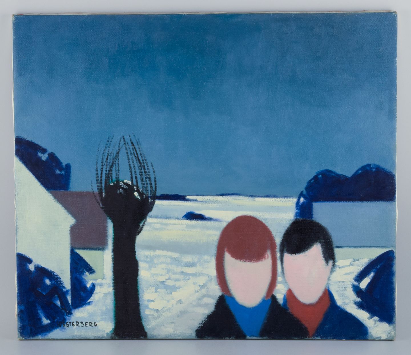 K. Westerberg, also known as Knud Horup, listed Danish artist, oil on canvas. Modernist style. Landscape with figures.1970s.