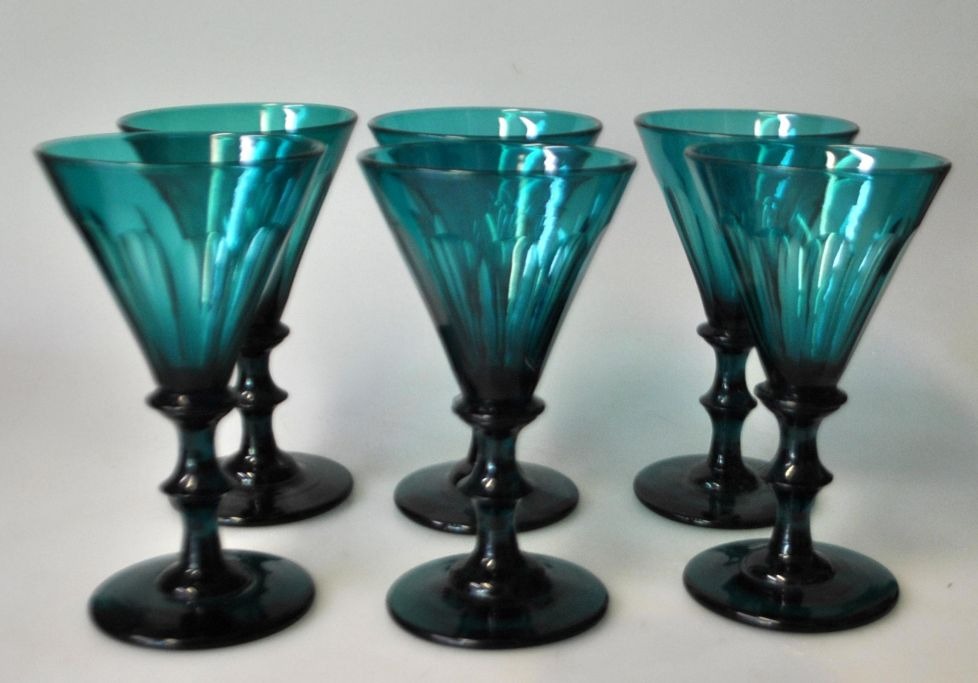 Anglais hvidvins glas med grøn kumme, 19. årh. Holmegård. Danmark. H.: 13.2 cm.Pt.: 6 stk. på lager.