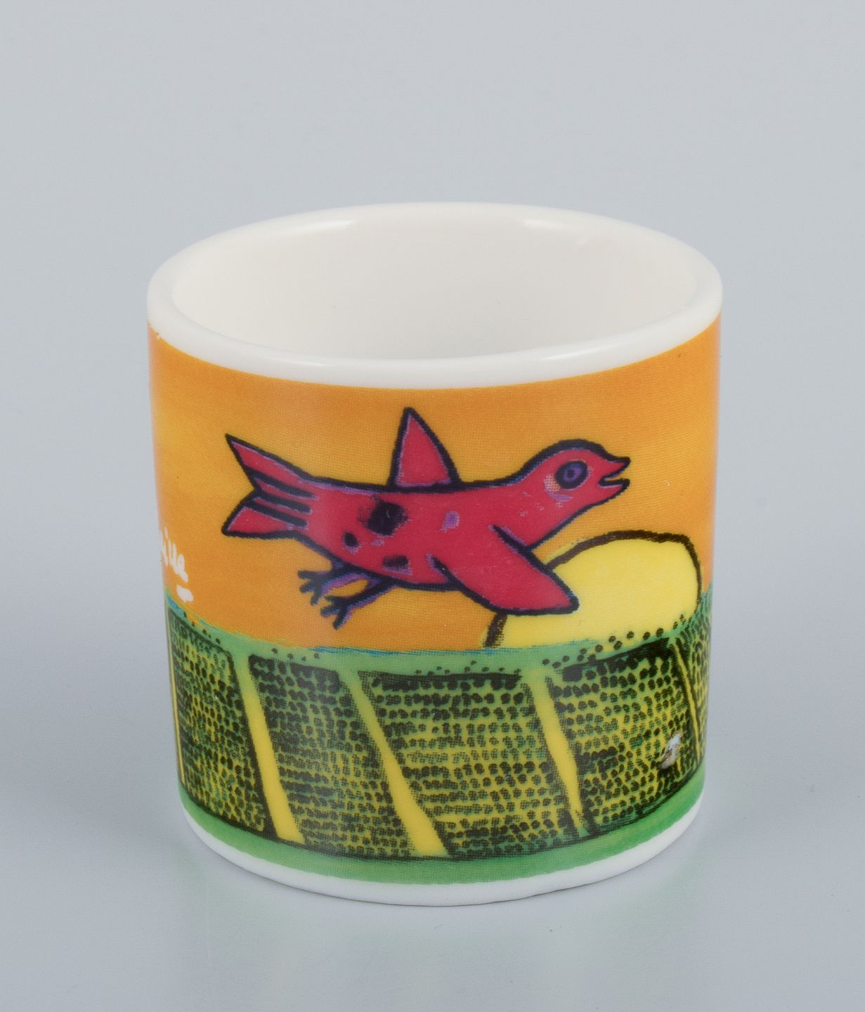 Corneille (Guillaume Cornelis van Beverloo), Hollandsk CoBrA kunstner (1922-2010). Kaffekop, tallerken og æggebæger i porcelæn dekoreret med fugle over mark med solopgang.