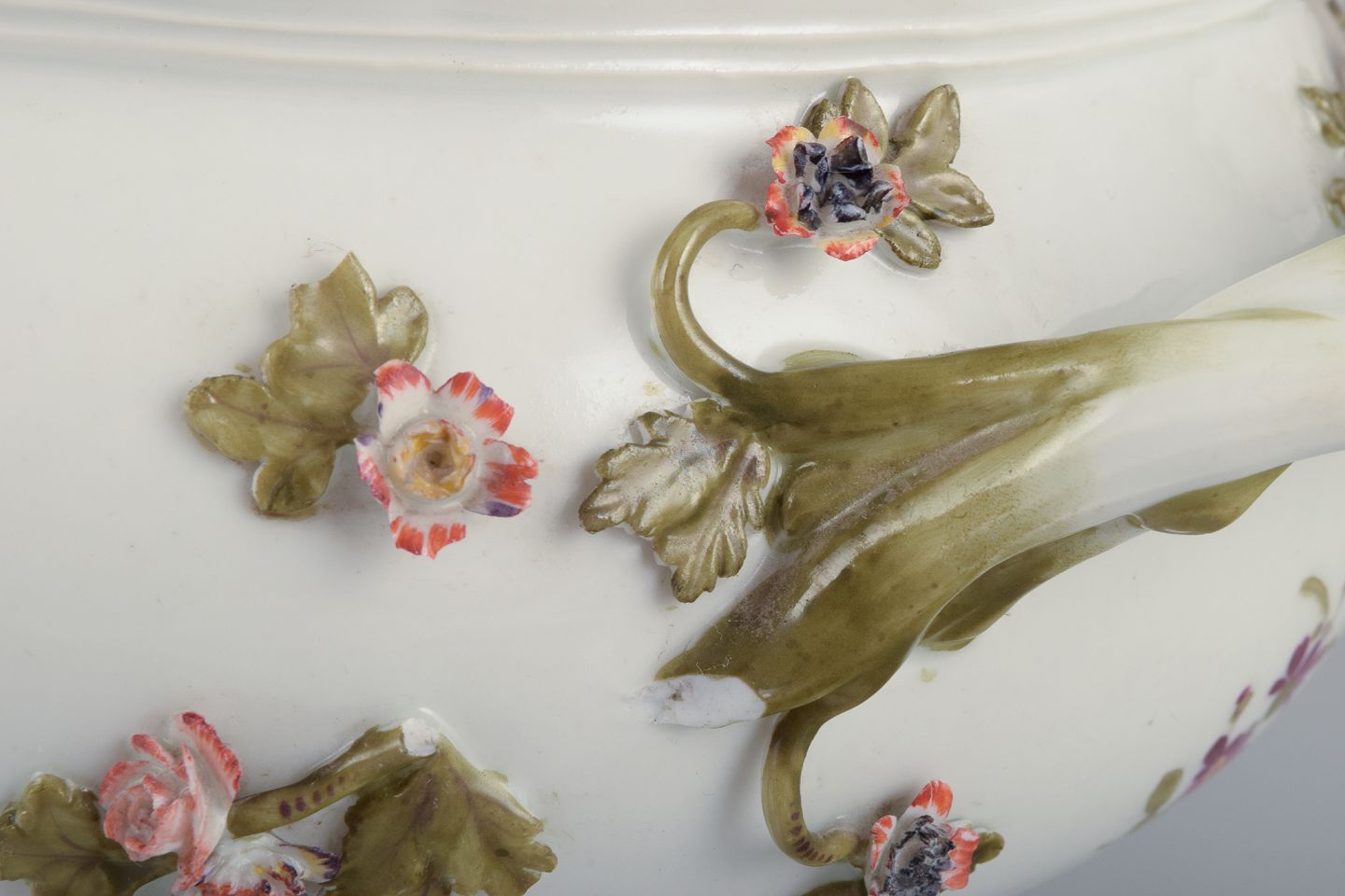 Meissen, Tyskland. Antik lågterrin håndmalet med polykrome blomster.Grenformet hanke.