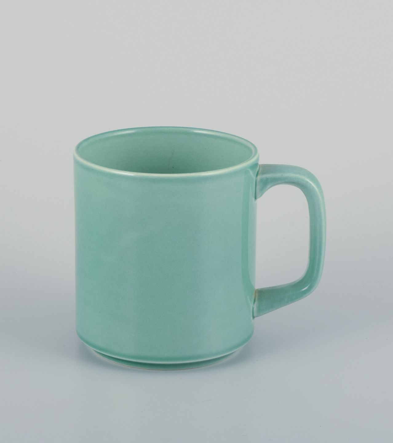 Royal Copenhagen, "4 All Seasons", four coffee mugs and a small oval dish in faience with green glaze.Dating from 1991-1995.