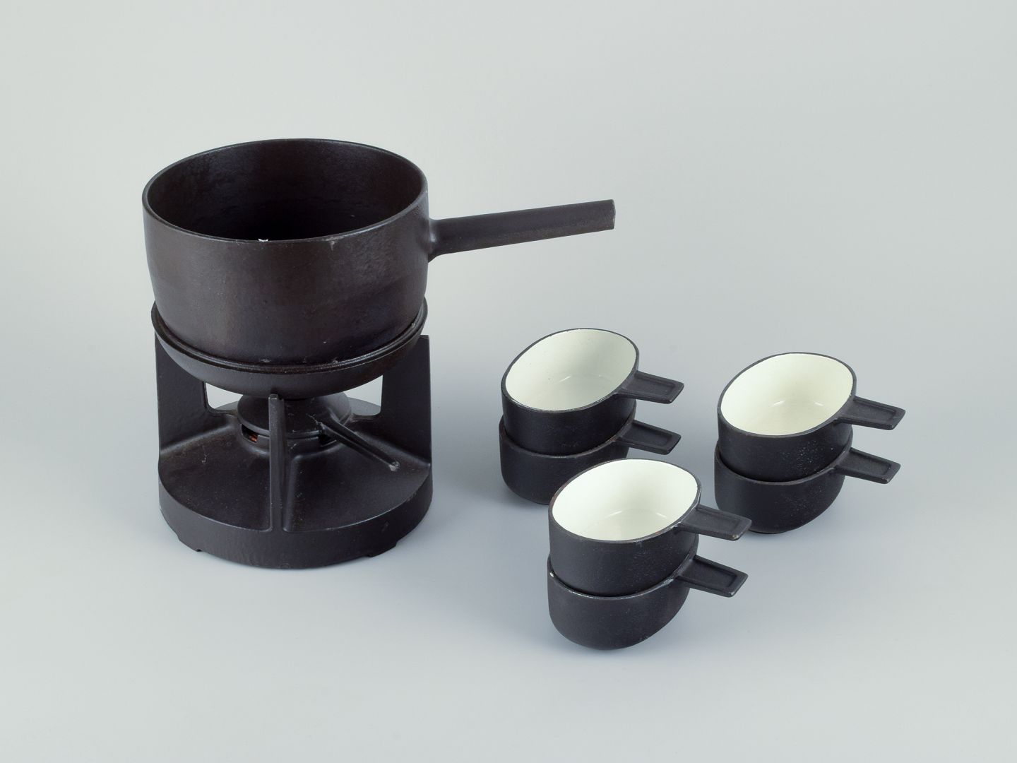 Digsmed Design, Denmark. Cast iron fondue set. Bowls with enamel lining. Serves six people.Stamped "Castirone." Label attached.