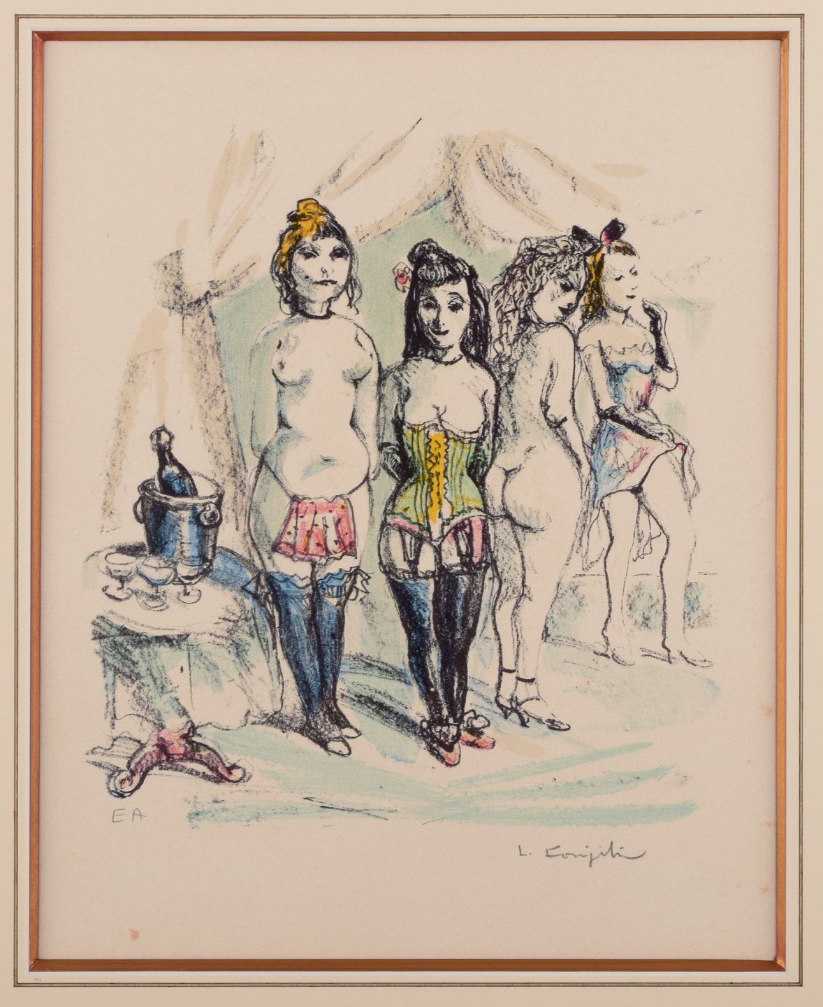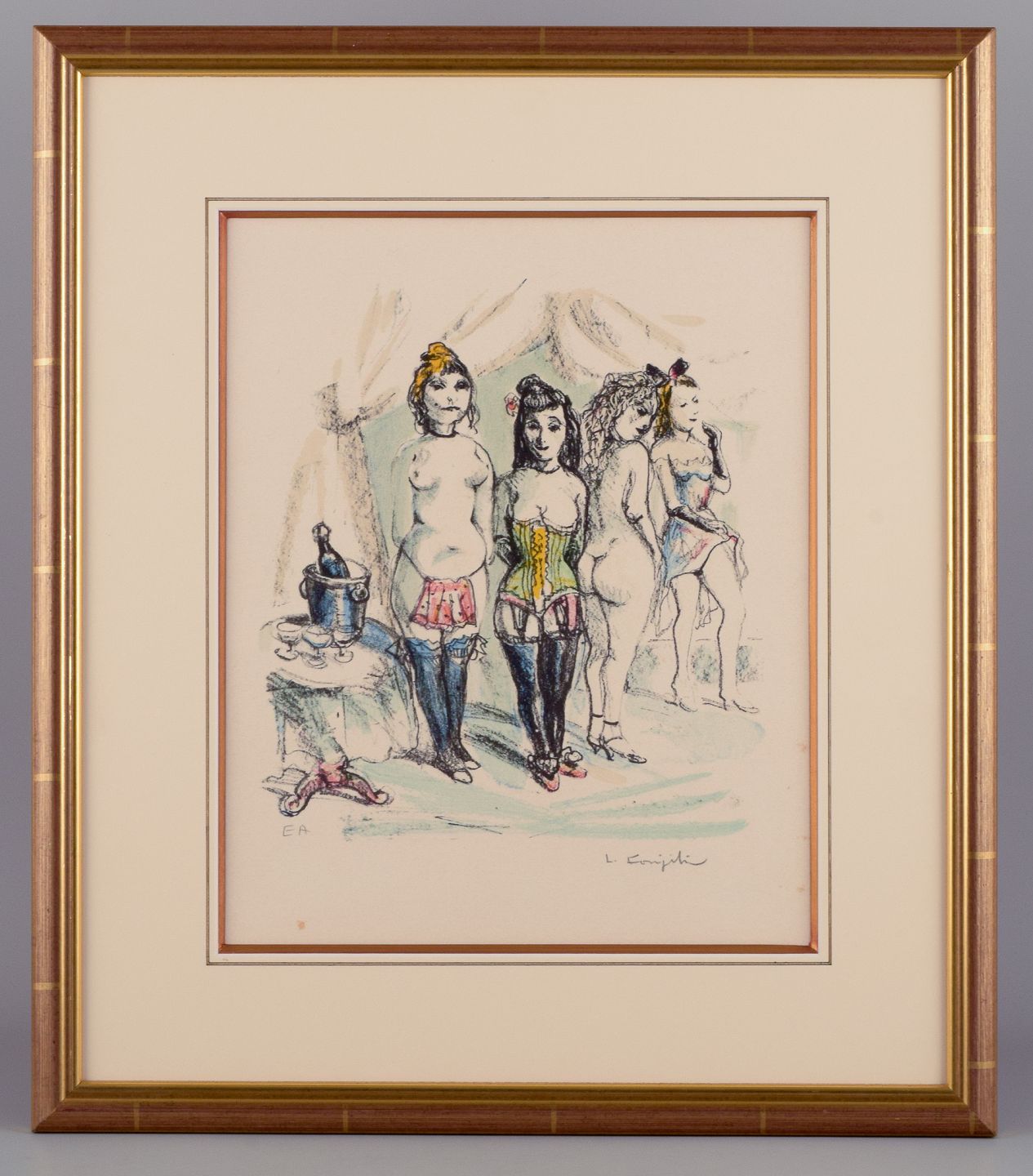 Léonard Tsuguharu Foujita (1886–1968), well listed Japanese/French artist. Color lithograph on paper. E. A. = Artist´s edition.Brothel scene.