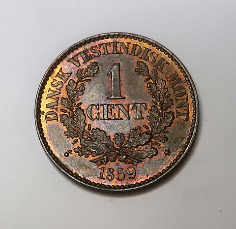 Dansk Vestindien. Frederik VII. 1 cent 1859. Flot velholdt mønt. Udstiller