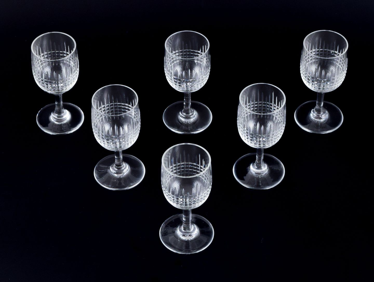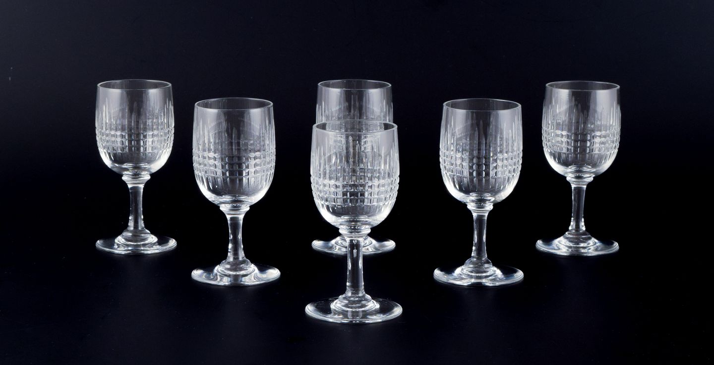 Baccarat, France. A set of six "Nancy" white wine glasses in clear crystal glass.Approximately 1930.
