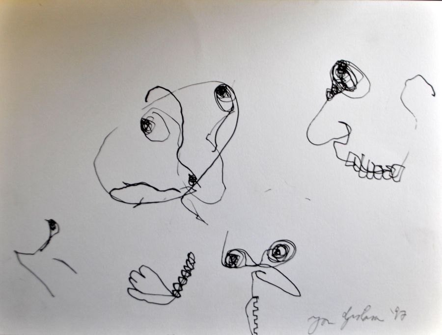 Gislason, Jon (1955 - ) Danmark: Ansigter. Tusch på papir. Signeret 1997. 27 x 35 cm.Uindrammet.