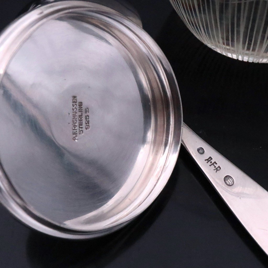 A.F. Rasmussen. Glass Jar with Sterling Silver Lid and Spoon.Art deco Sterling silver Lid and 830s Silver Spoon designed and crafted by A.F. Rasmussen - Aarhus 1903 - 1998.
