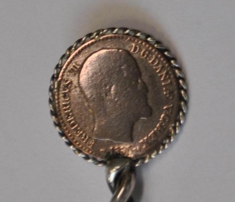 Dansk antik røre ske i sølv, 19. årh. Med 2 indfattede sølvmønter, bl.a. 20 C. mønt fra Dansk Vestindien fra 1859 og 4 skilling rigsmønt fra 1856. Med snoet skaft. L.: 16 cm.