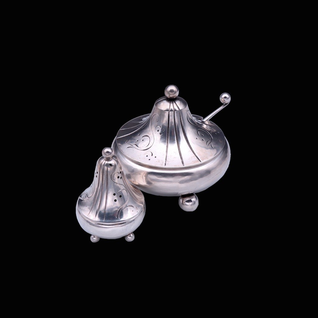 Georg Jensen. Sterling Salt Cellar & Pepper Shaker #433 - Harald Nielsen.Salt Cellar #433A with blue Enamel and Spoon.