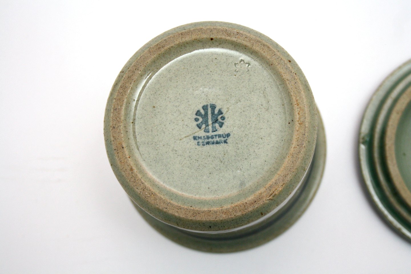 Knabstrup, Kattegat stentøjsstel grå glasur med blå kant og bærmotiv. Designet af Inger Persson 1975. Sukker eller marmeladeskål med låg. Diameter 11 cm. Højde 8 cm. Pris: 150 kr. stk. Lager: 1 Udstiller