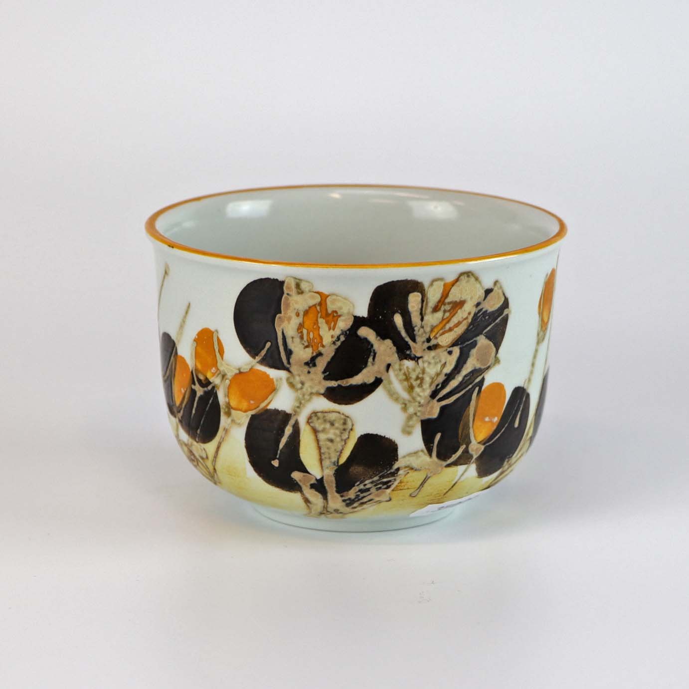 Urtepotteskjuler af fajance, glaseret med hvid og dekoreret med gyldne og brune nuancer. No 962/3759