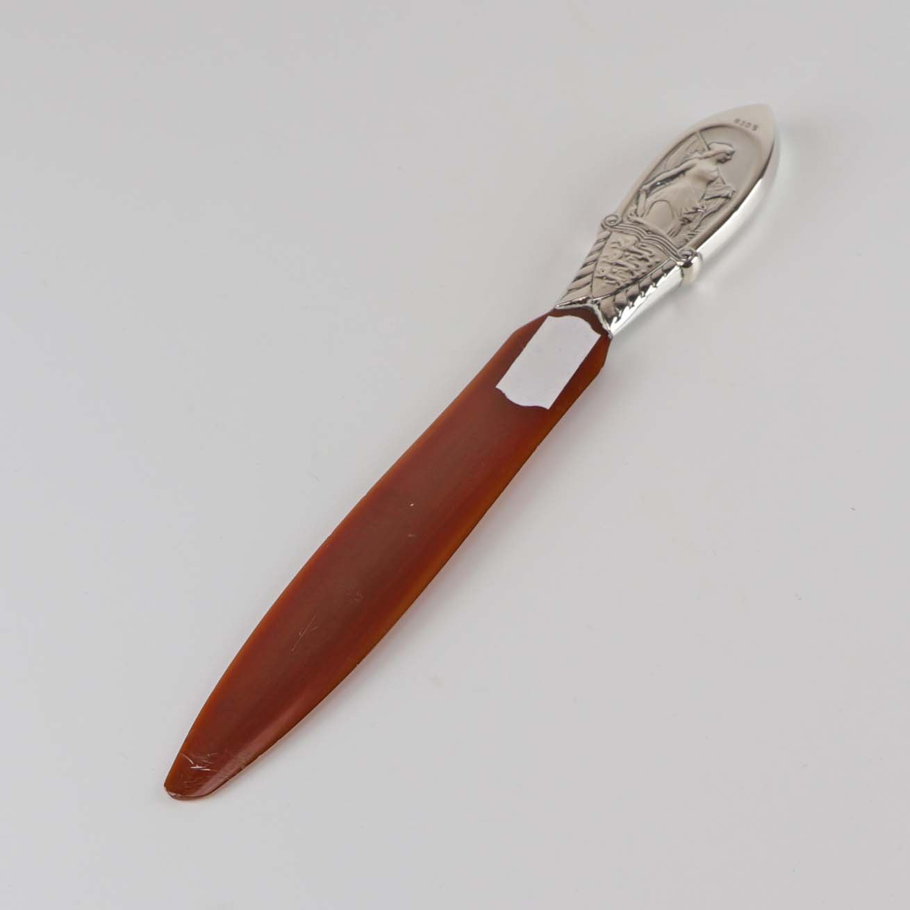 Brevkniv af ben. Top af sølv med motiv af kvinde med sværd og flag samt tre løverStemplet 830s
