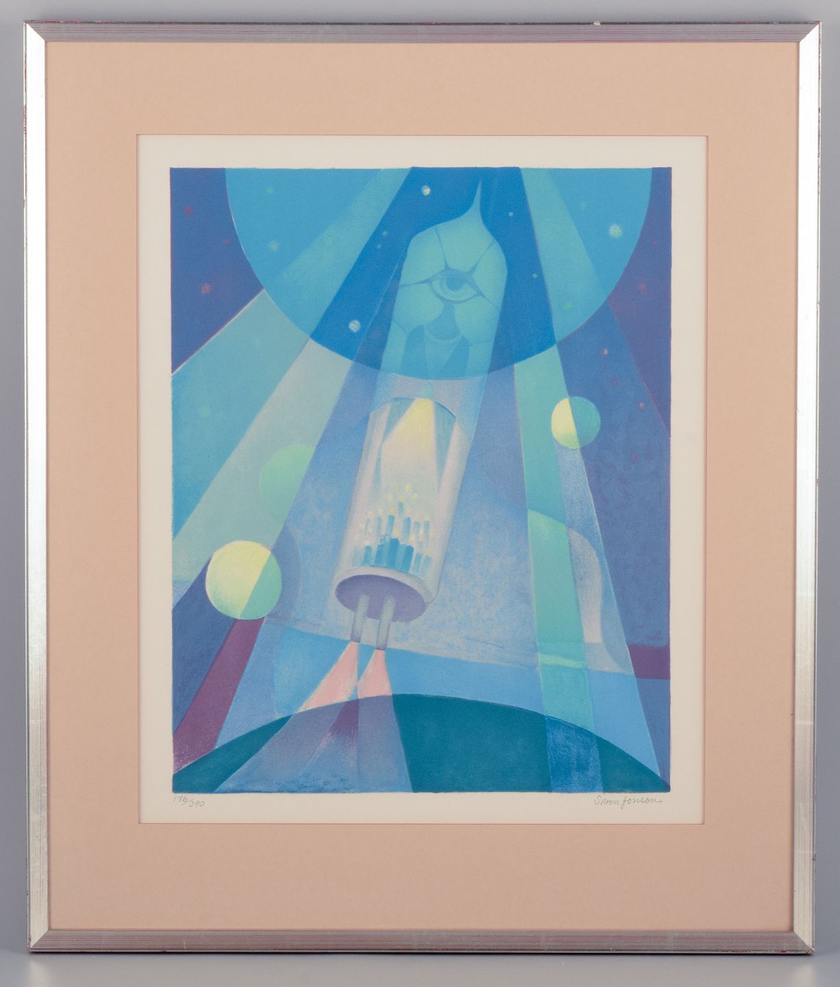 Sven Jonson (1902-1981), Swedish artist. Color lithograph on paper.Cubist-style depiction of a spacecraft.