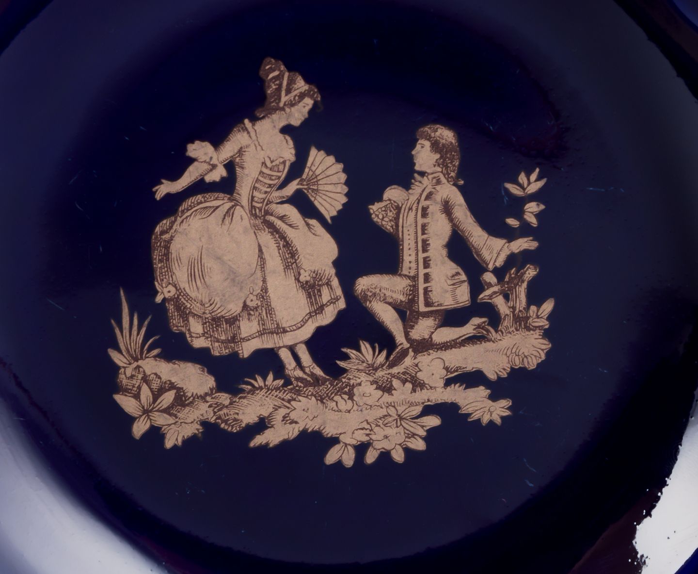 Limoges, France. Two small porcelain bowls decorated with 22-karat gold leaf and a beautiful royal blue glaze. Scène galante.Approximately 1970.