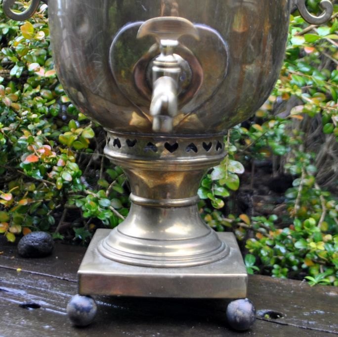 Themaskine i messing, 19. årh. Danmark. På firkantet fod med trækugleben. Korpus med to hanke i træ og tud. Ustemplet. H: 49 cm. D: 29 cm.NB. Med mindre reperation.