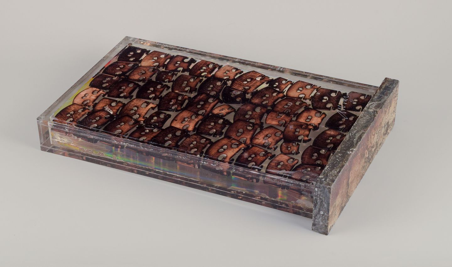 Fernandez Arman (1970–1993). Accumulation of burnt wood violin bridges in resin, framed in plexiglass. Base in Norwegian Porsgrunn marble.