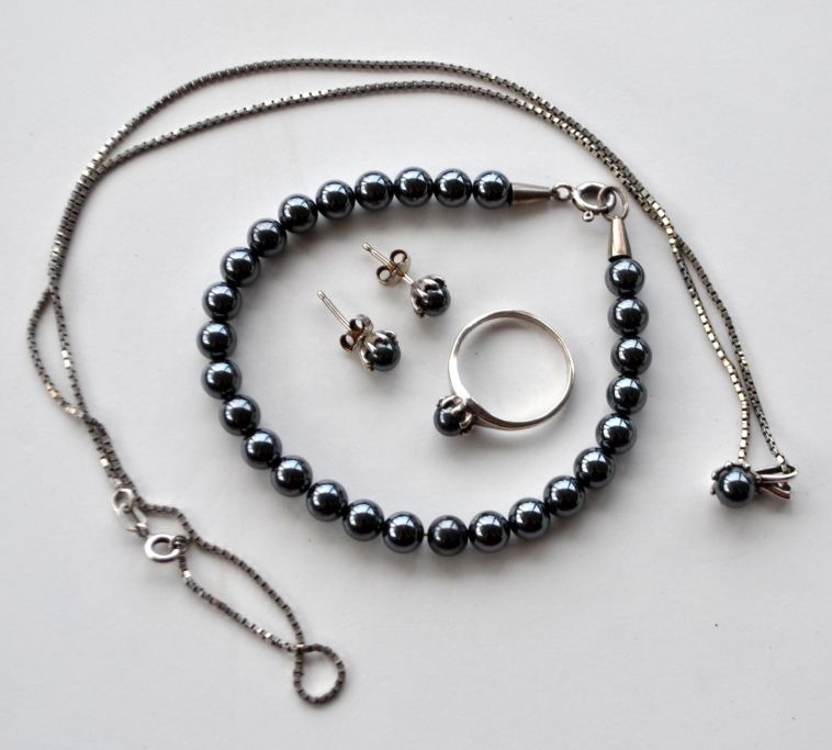 Pernille Corydon jewelry set in sterling silver with bloodstone (hematite). 2015. Denmark. Set consisting of necklace with pendant, bracelet, earrings and ring. Stamped 925. In original box. Necklace L: 90 cm. Bracelet L: 20 cm. Ring size 54. Each blood stone Dia: 0.5 cm.NB: only sold together