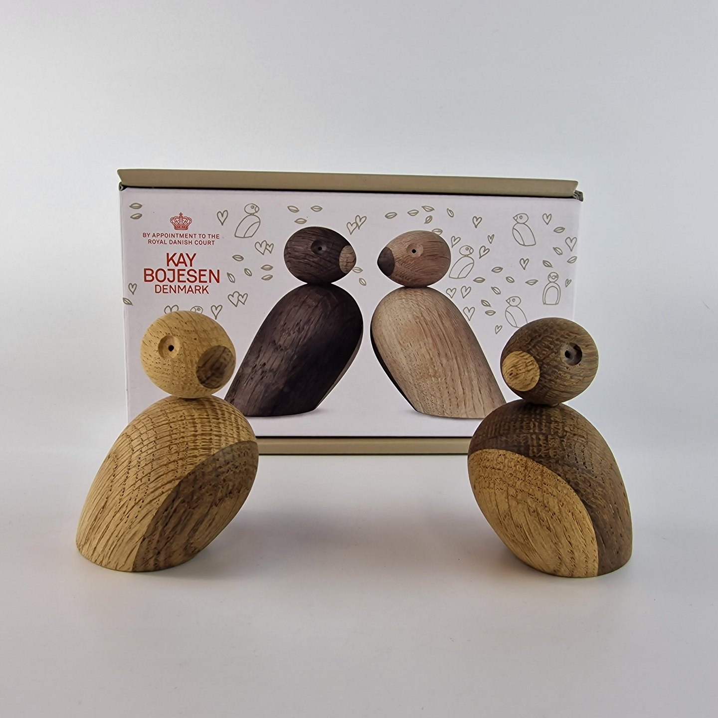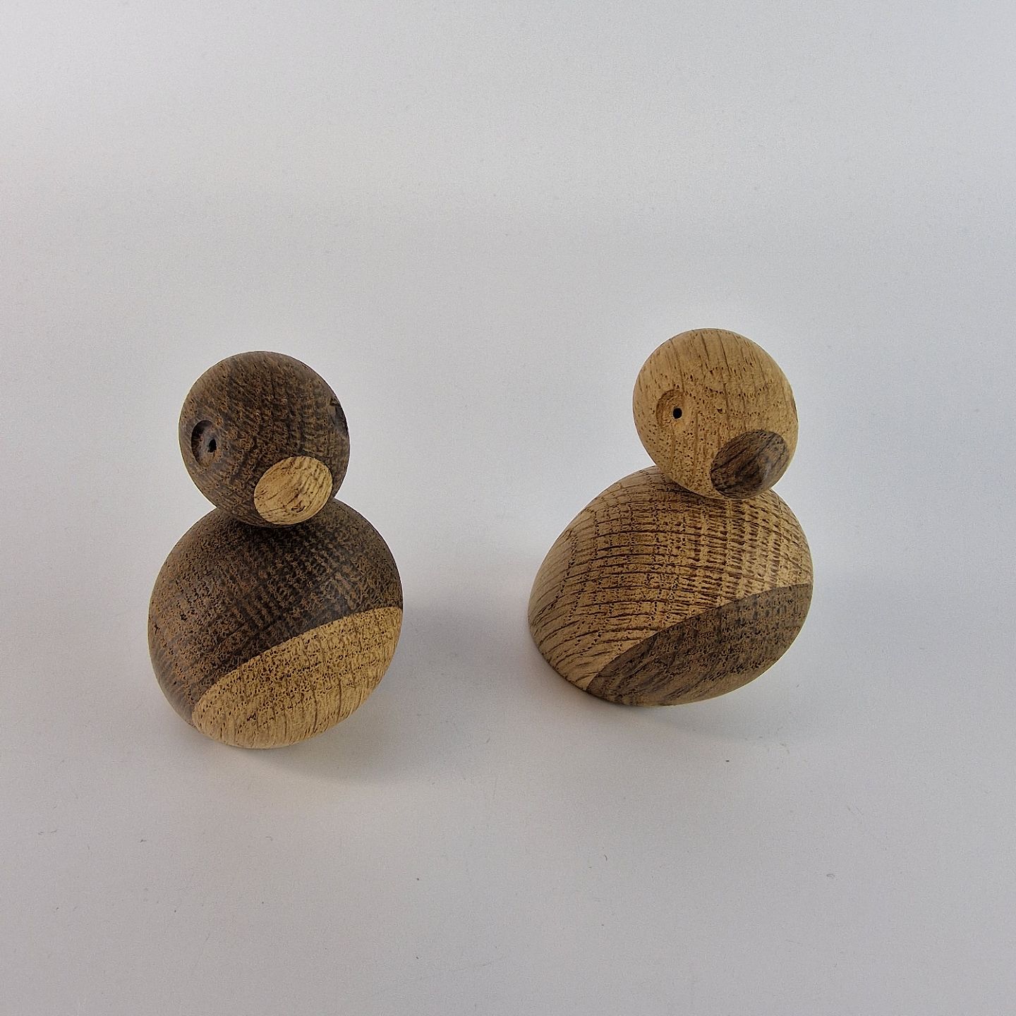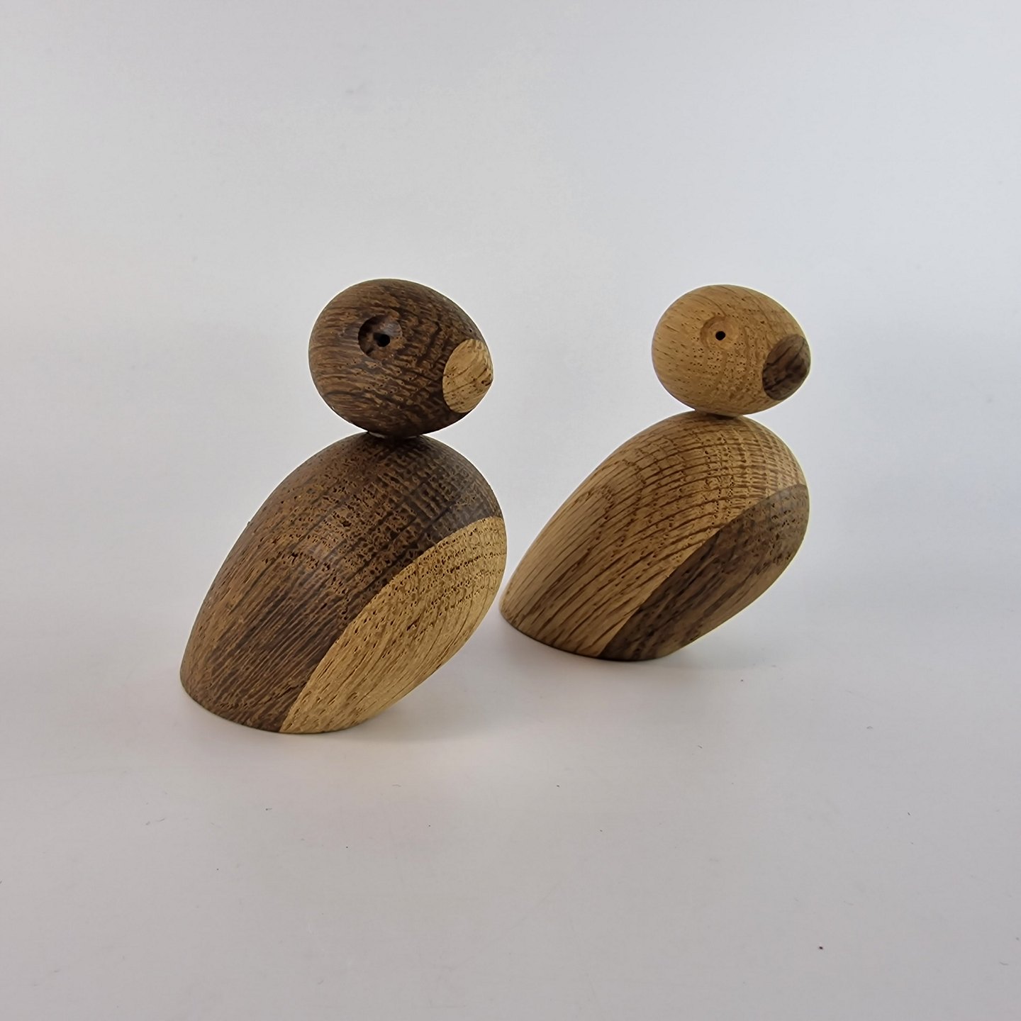 Spurvepar fremstillet i blødt træ af natureg og røget eg. Spurveparret blev designet i midten af 1930’erne Design Kay Bojesen