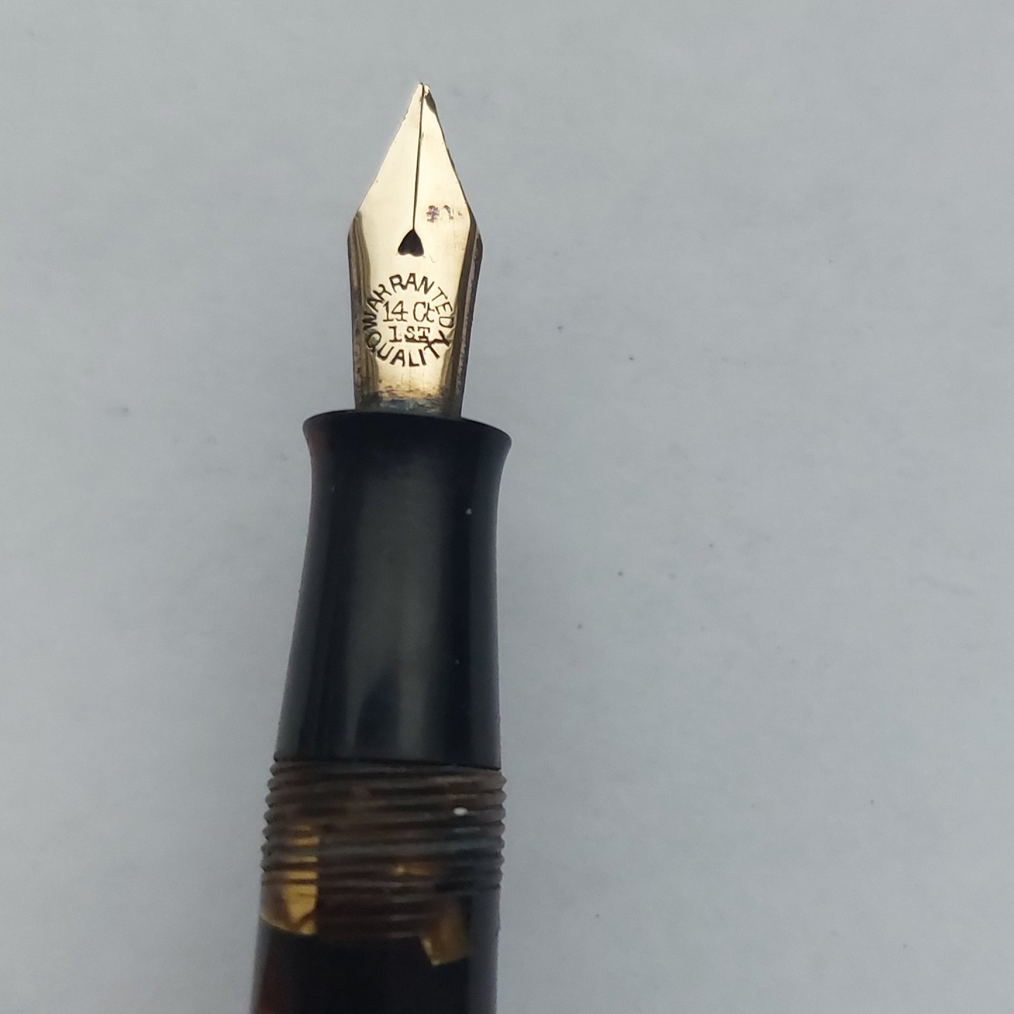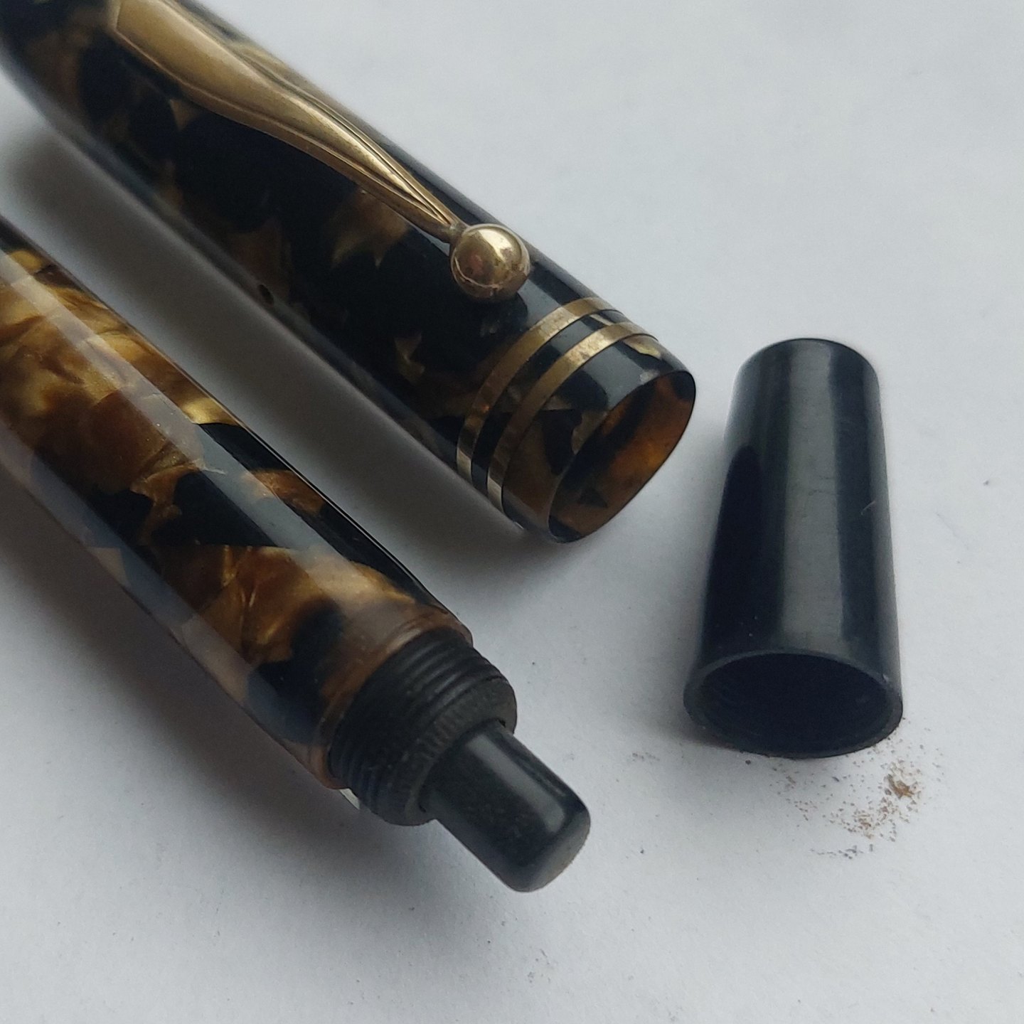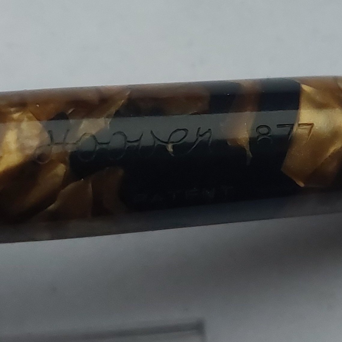 Green and black marbled Hoover No. 877 fountain pen. Push button filler. In good condition with no damage or repairs. 14 karat gold nib. A new rubber sac must be inserted before it can be filled with ink. New rubber sack can be inserted for an extra payment of DKK 200.- Measurements: L. 12.3 cm