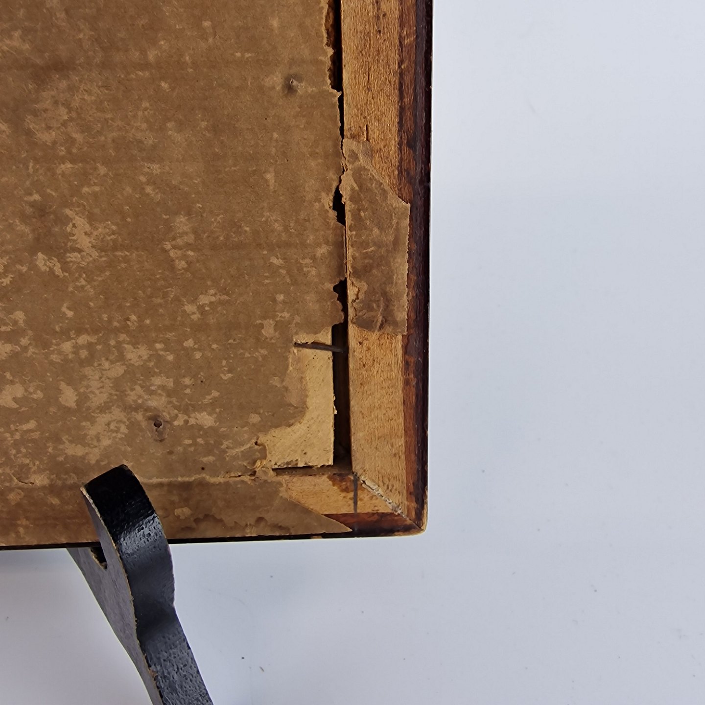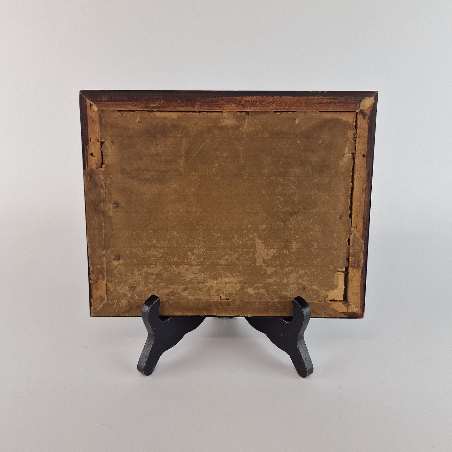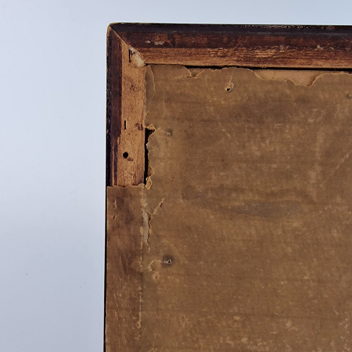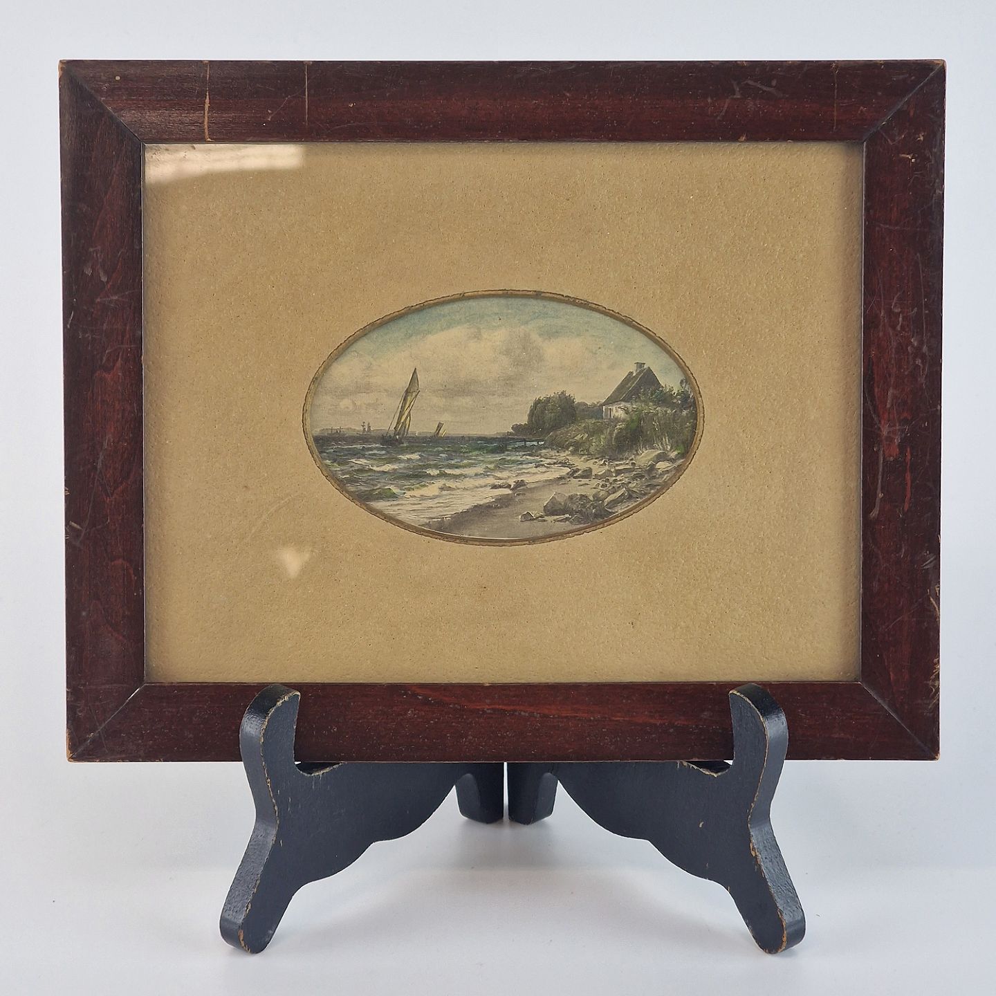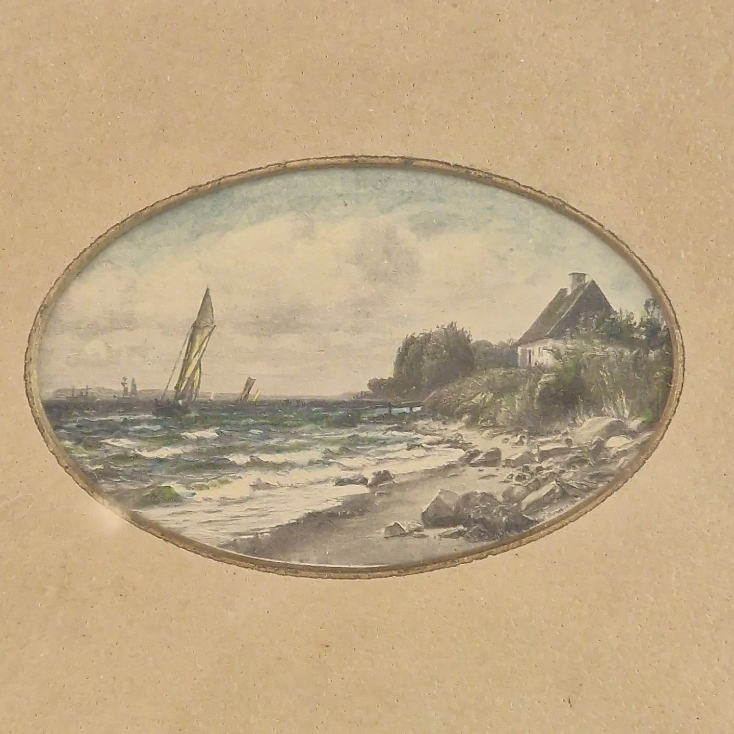 Indrammet ovalt landskabsmaleri i passepartout med motiv af kyststrækning. Et hus beliggende tæt på stranden og seljbåde i havetIkke signeret