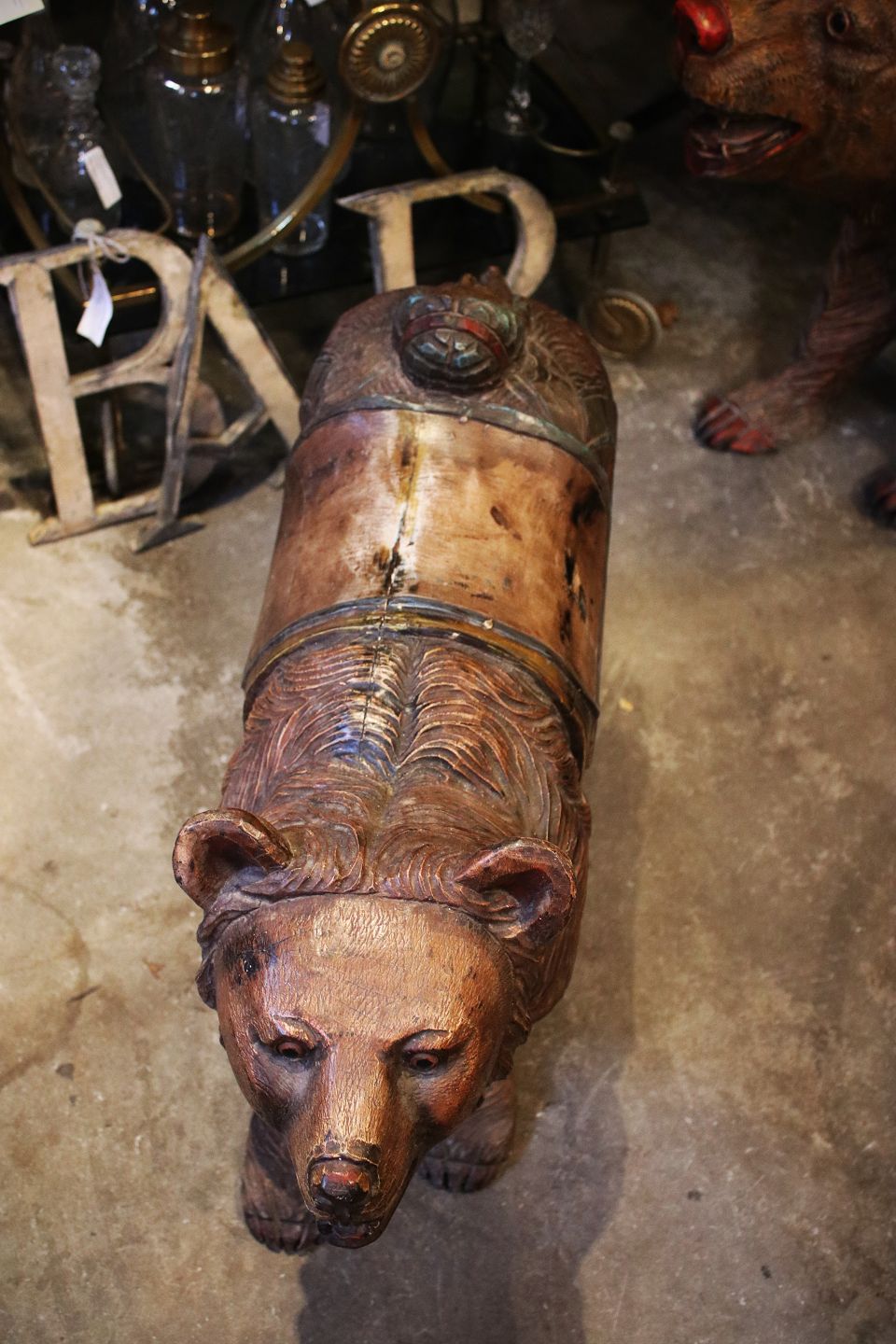 Decorative, 1800s carousel bear in carved wood with a really nice patina. H: 54 cm. L: 92cm. W: 25cm.Item number: Karrusel bjørn 2
