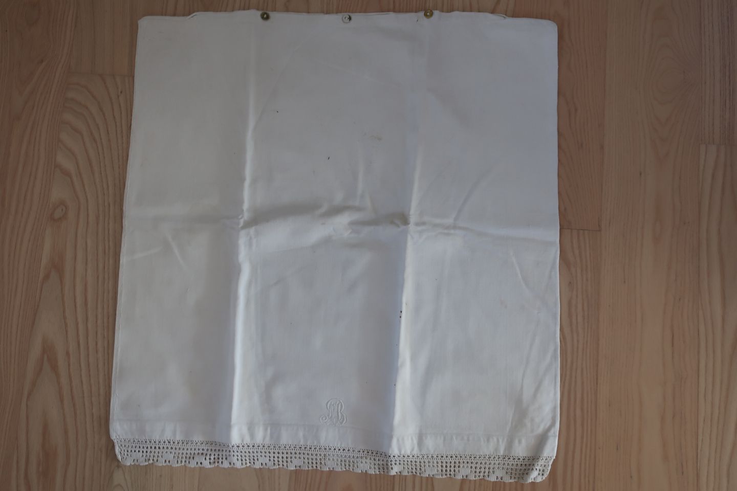 Pudevår med håndbroderede initialer samt tunger i kanter, - og så er der stofknapper