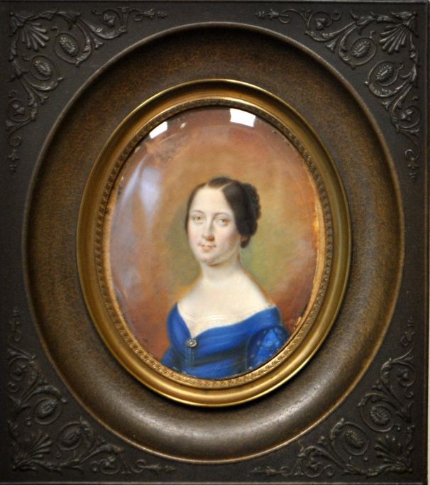 Fransk miniature maleri af kvinde, 19. årh. Usigneret. Oval. Malt på ben. I en fransk ramme af presset materiale. 15 x 13,5 cmRammen er meget speciel med ornamentik. Signeret bagpå: H.F.V a Paris. Rammen er perfekt.