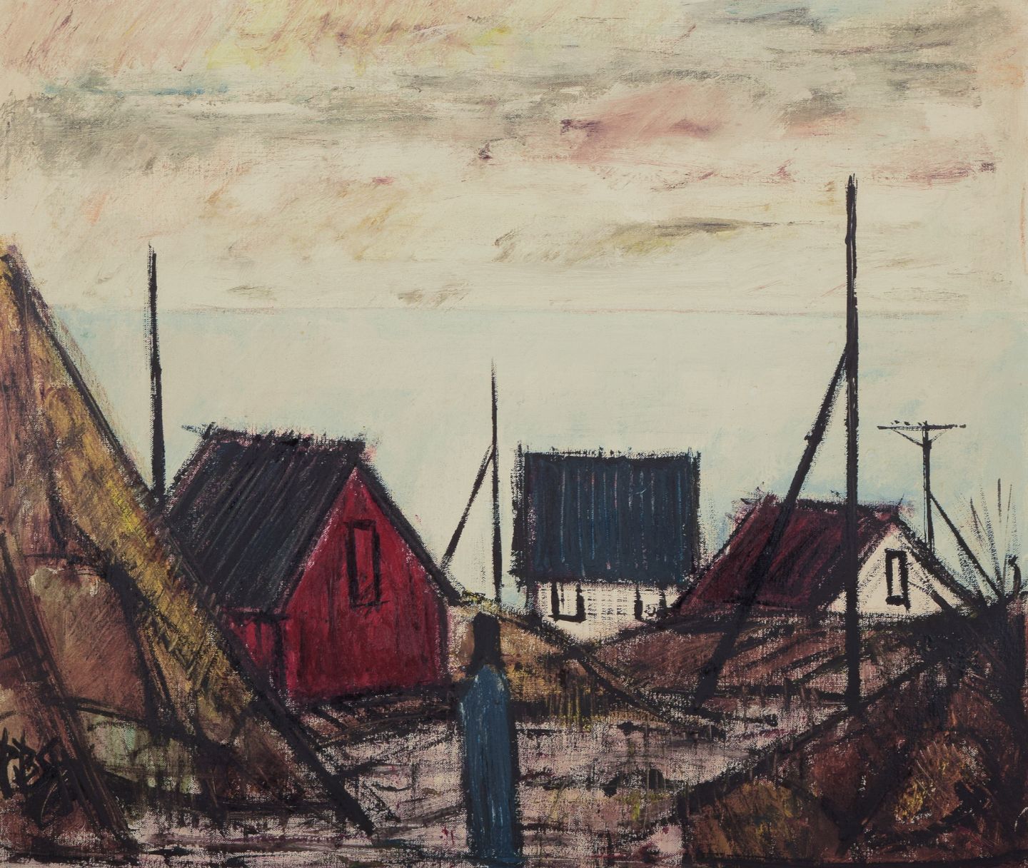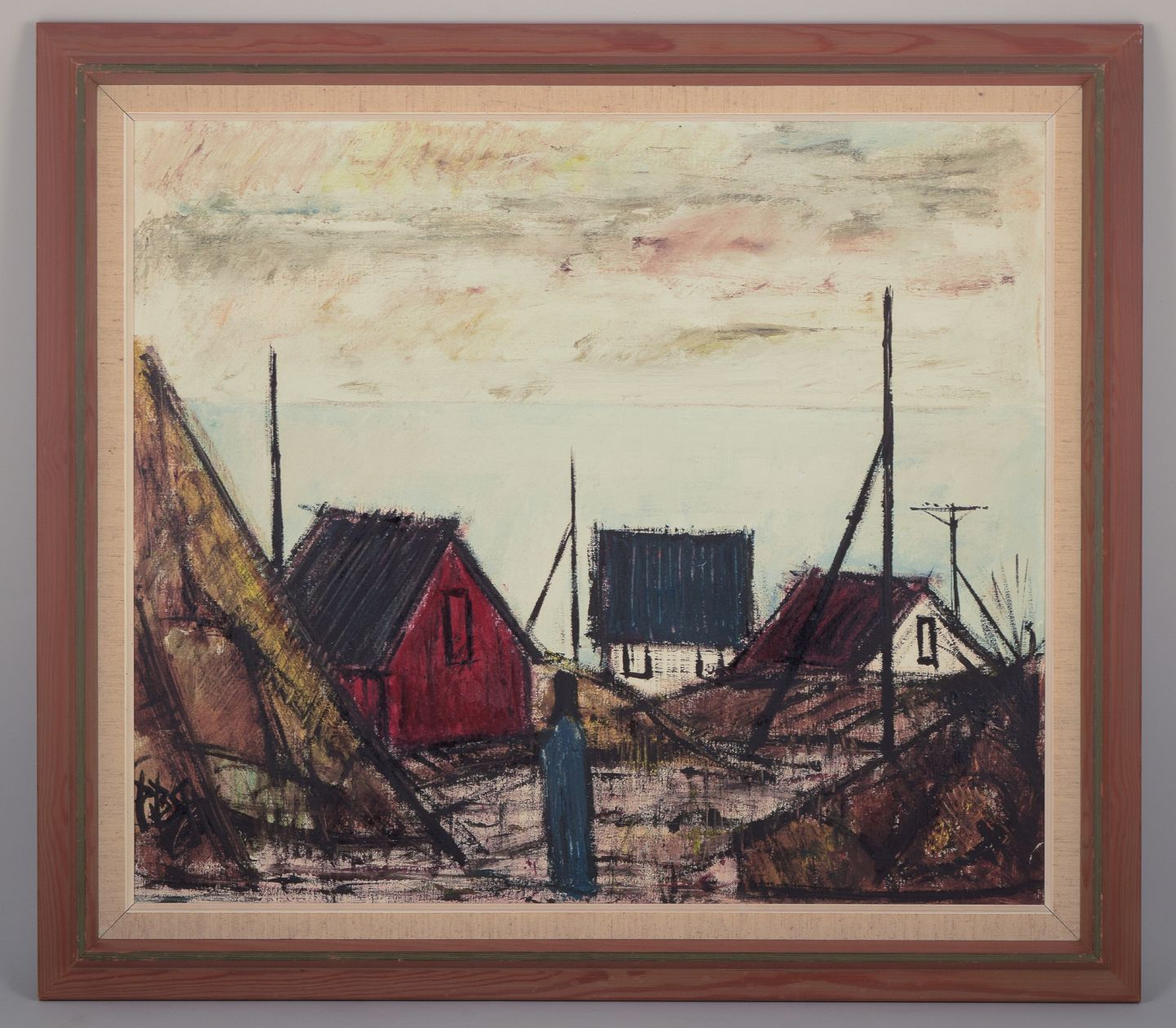 Peder Brøndum Sørensen (1931-2003), Danish painter, oil on board."Houses by the Sea." Modernist motif.