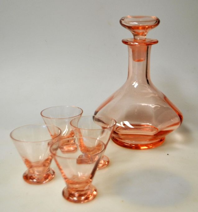 Viol decanter and 4 glasses, Holmegård, Denmark, design: Jacob E. Bang. Salmon colored glass. Height carafe: 17 cm. Perfect condition. 4 small glasses, 3 of which have minor chips. H: 5.2 cm.Item number: 26070