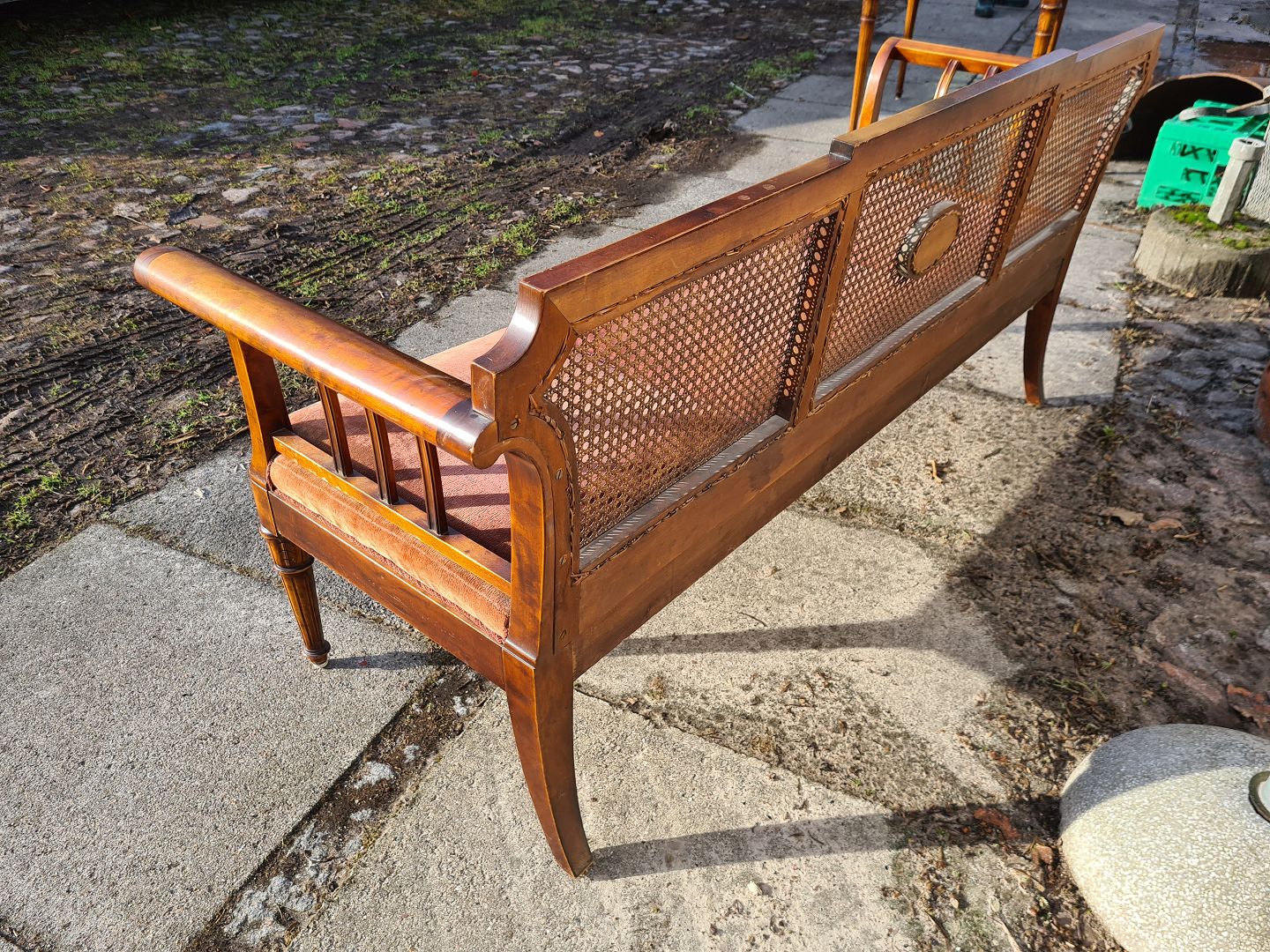 3 pers. bænk i birk med ryg i rørflet, udskæringer på armlæn og med velourbetrukket sæde. Svensk produceret i 1930'erne. Fremstår pæn, velholdt og udmærket stabil. Dog med brugsspor på sæde og manglende liste på ryg i venstre side. (Billede)Bænken er en del af en hel salon stue med nr. 80447