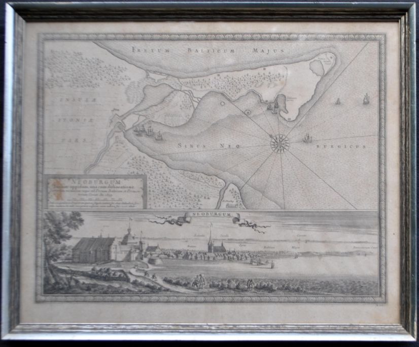 Dahlberg, Erik Jönsson (1625 - 1703) Sweden: Prospect of Nyborg. 1659. Copper engraving. Neoburgum. Fioniæ oppidum una cum delineatione. Map of the city and the Great Belt. Ball size: 33 x 41 cm.Framed in silver frame: 36 x 44 c.