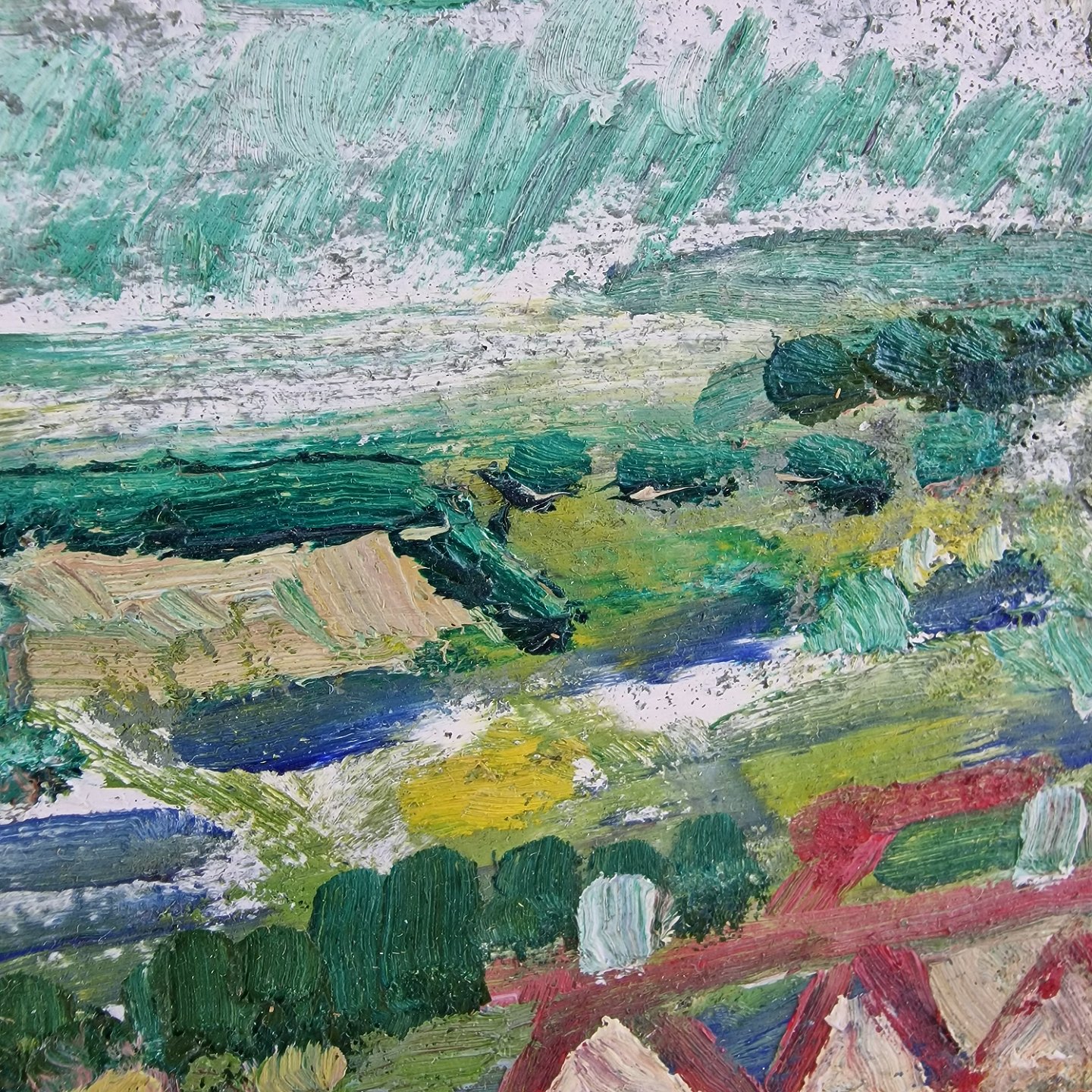 Maleri. Leo Thellefsen 1985.Landskab, tagrygge.