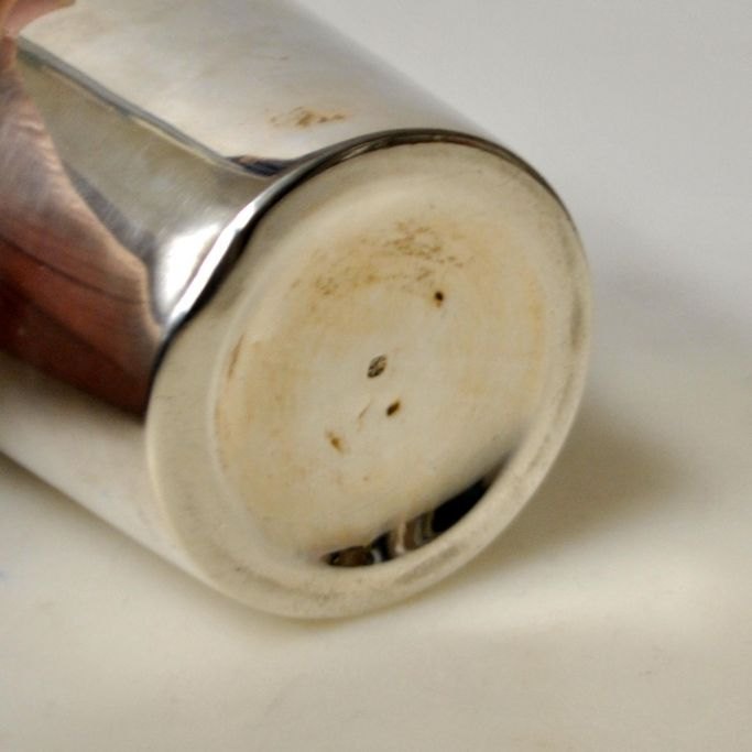 Silver cup, 19th century. Stamped. Slightly smooth conical shape with decorative band on top. Indistinctly stamped. Height: 9 cm. Weight: 105 grams.Item number: 26171