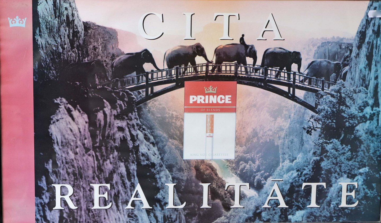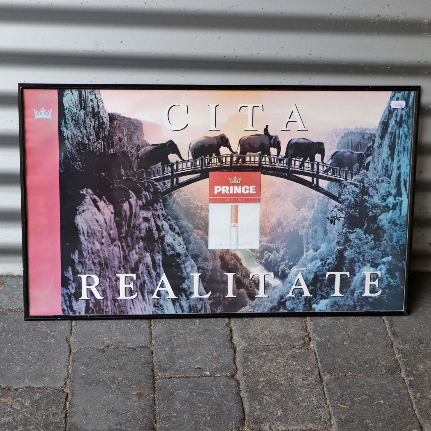 Indrammet tryk i sort ramme. Udenlandsk reklametryk for Prince cigaretter med titlen Cita Realitâte (Rumænsk og betyder: Citat Virkeligheden) med motiv af en cigaretpakke, hvor baggrunden viser elefanter på vej over en bro, som forbinder kløften.Producent Prince (i dag ejet af British American Tobacco)