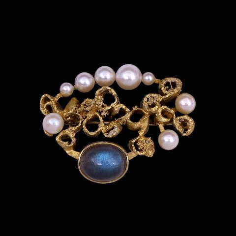 Jørgen Peter Vang. Broche i 14k guld med perler og labradorit.Tegnet og udført hos Jørgen Peter Vang - Copenhagen 1965 -