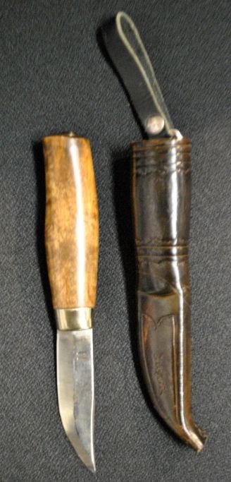 En norsk same kniv, 20. årh. Kniv med skæft i birk. Håndsmedet blad, stemplet: N. Skede af læder med dekorationer, stemplet.: M. L.: 21 cm.Meget velholdt.