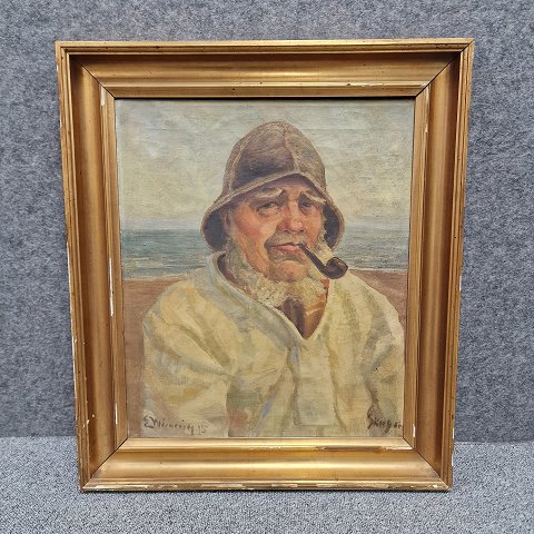 Portrætmaleri på lærred med motiv af fisker med hat og pibe. Titel “Skagen”.Kunstner Emil Weinrich (1892-1975)