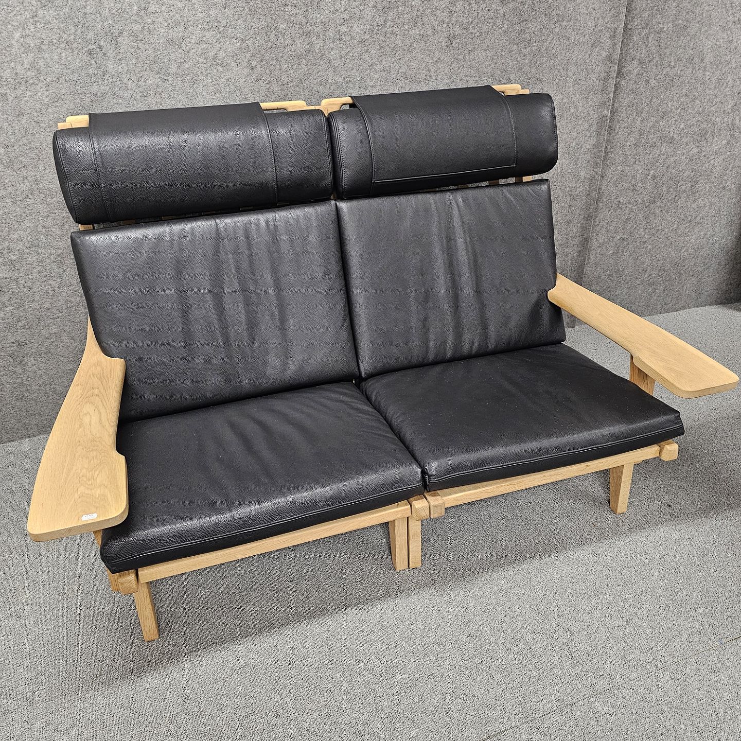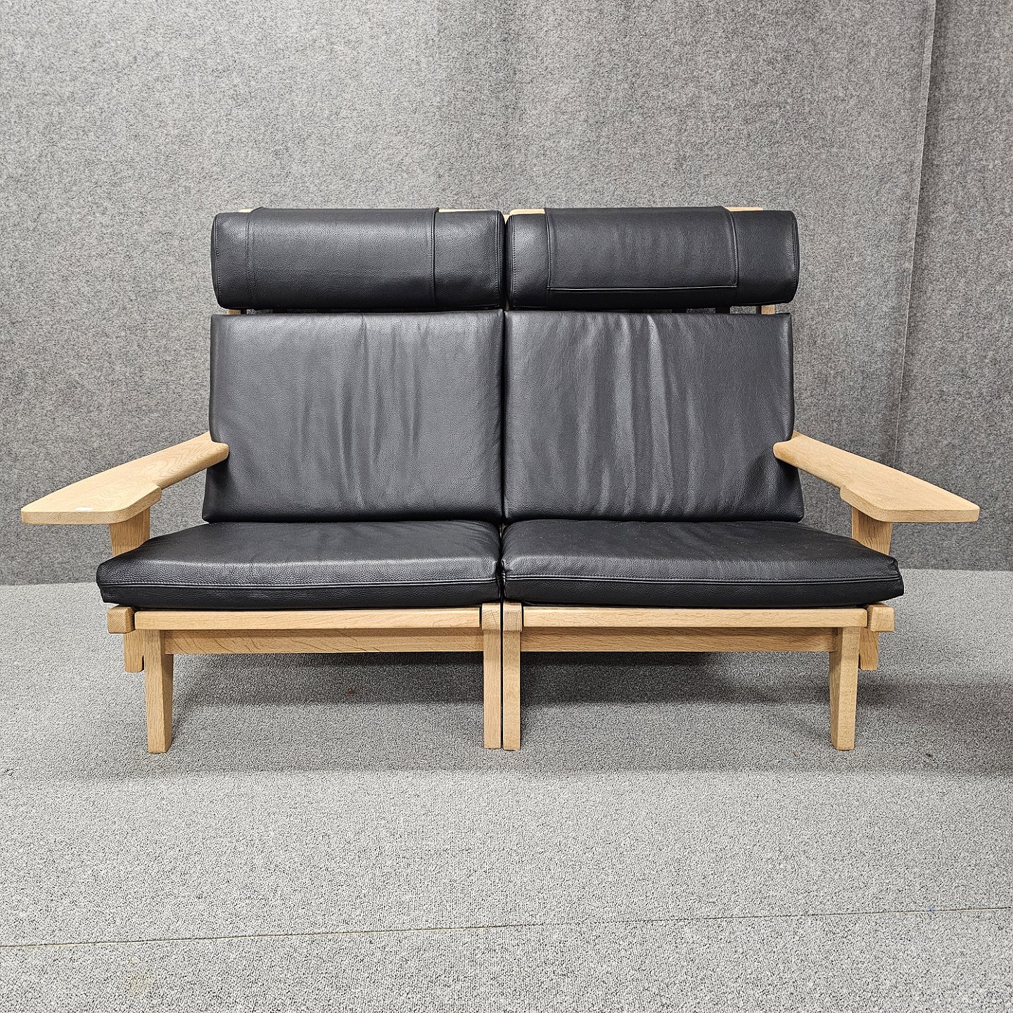 To personers sofa med armlæn og stel i eg. Derudover 3-delt læderhynder i sortlæder i god kvalitet, fremstår ubrugtVi har 2 stk. på lager