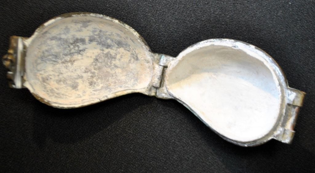 Indian bronze container for burnt lime, 19th century For betel chewing. Container decorated. L.: 13 cm. Dia.: 9 cm. Height: 5 cm. Betel nut, betel leaves and burnt lime are mixed and prepared in the cheek. After a while, one can spit red saliva in a long stream.Item number: 26460