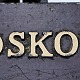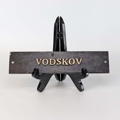 Ældre skilt i sortmalet metal med lyse udstående bogstaver med teksten VodskovProducent Ukendt