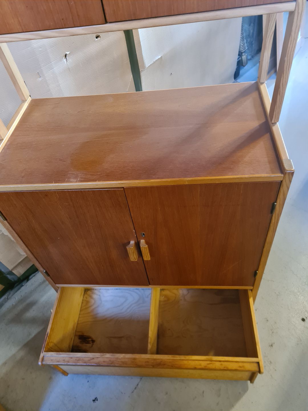 Reolsektion i massivt fyrretræ og fineret teaktræ, fra 1960erne.Den har brugsspor.